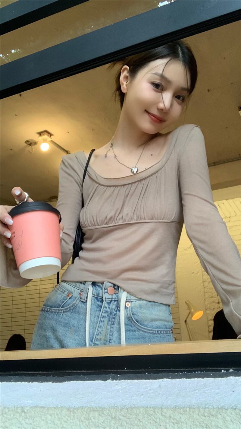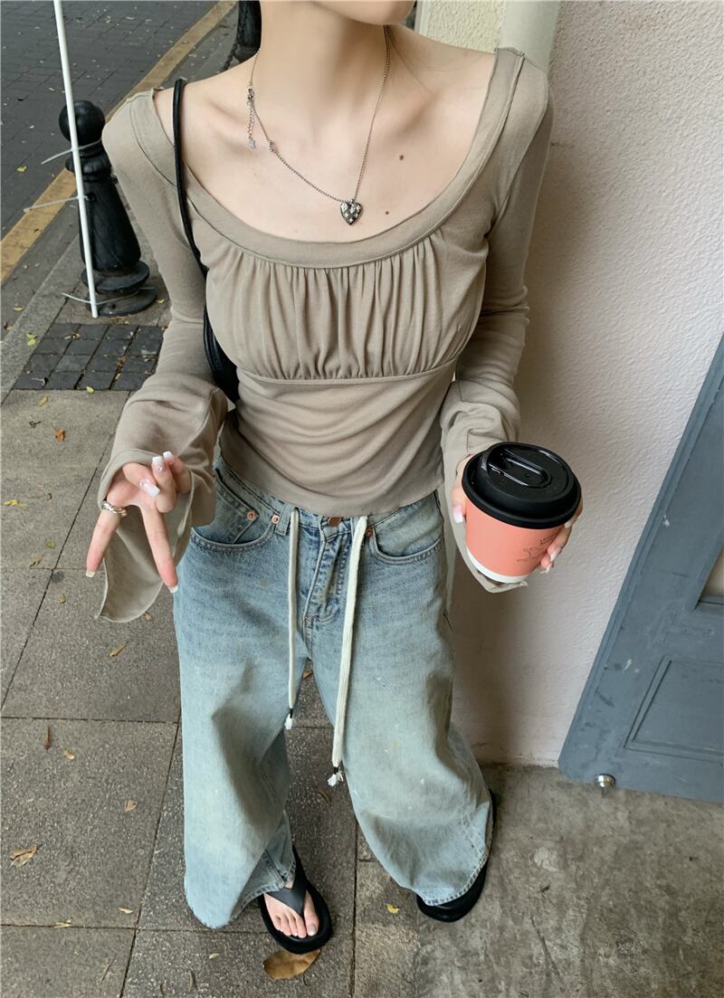 sense pleated square-neck long-sleeved T-shirt women's autumn 2022 new chic bell-sleeved slim fit top ロング プリーツ オータム 秋物 スリム Tシャツ スクウェア 0921920452600327