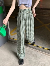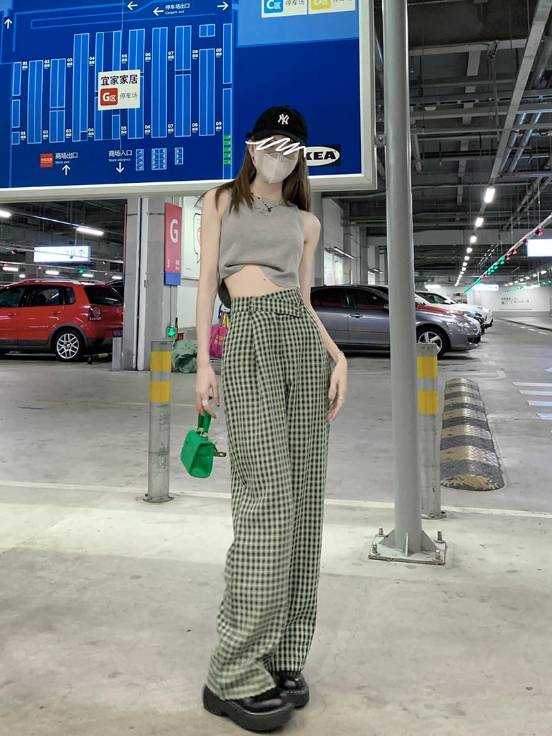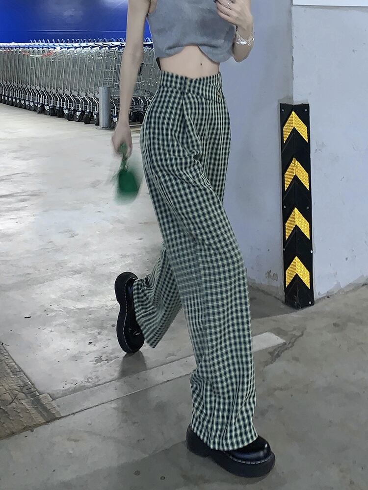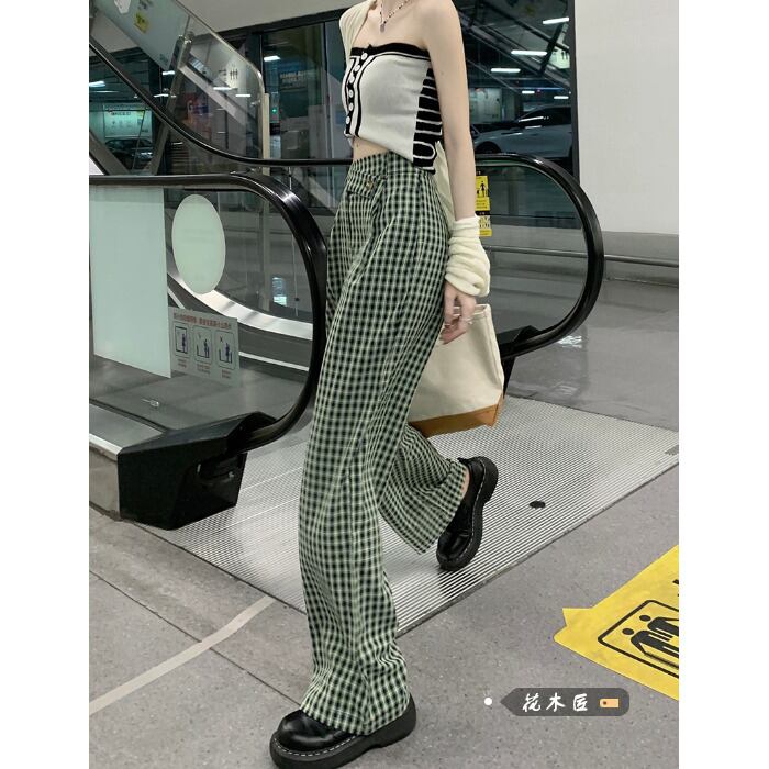 Green plaid pants women's autumn high waist slim casual pants vertical straight wide leg pants retro loose mopping pants ハイウェスト レトロ カジュアル オータム 秋物 スリム ワイドレッグ ワイドパンツ グリーン 0921939535849757