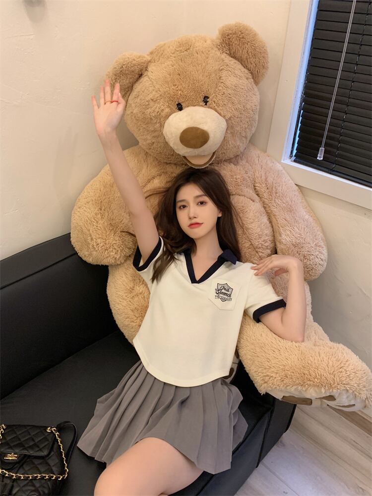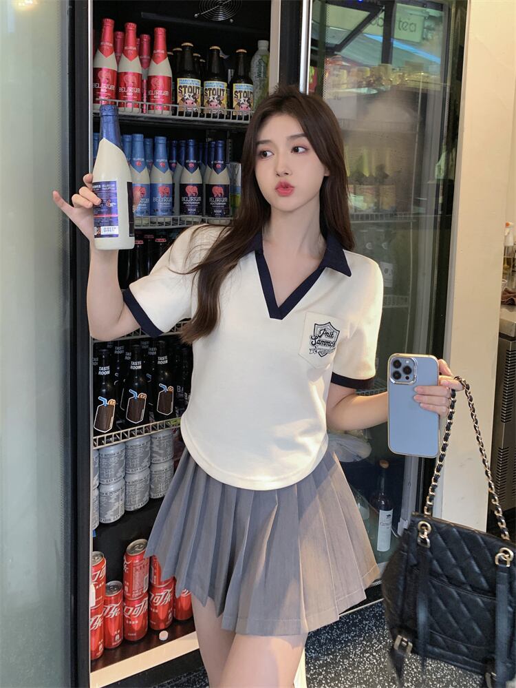 カレッジスタイルのカラーブロッキングVネック半袖Tシャツレディース2022年夏新韓国版デザインポケットスリムフィットと薄手トップ サマー 夏物 0921962035213413