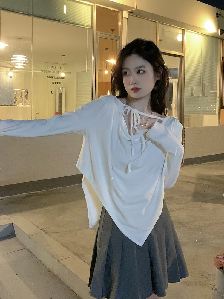 sense niche lace up long-sleeved T-shirt women's autumn 2022 new pure desire temperament irregular thin top ins ロング レース オータム 秋物 Tシャツ レースアップ ピュア 0921997723656887