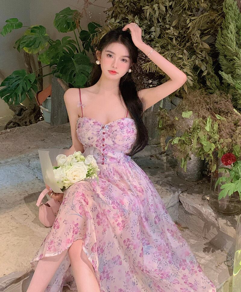 Gentle wind sweet floral suspender dress women's summer 2022 new French style waist and thin mid-length skirt 大人ガーリー スウィート キュート カジュアル サマー 夏物 花柄 スカート 0921947680142147