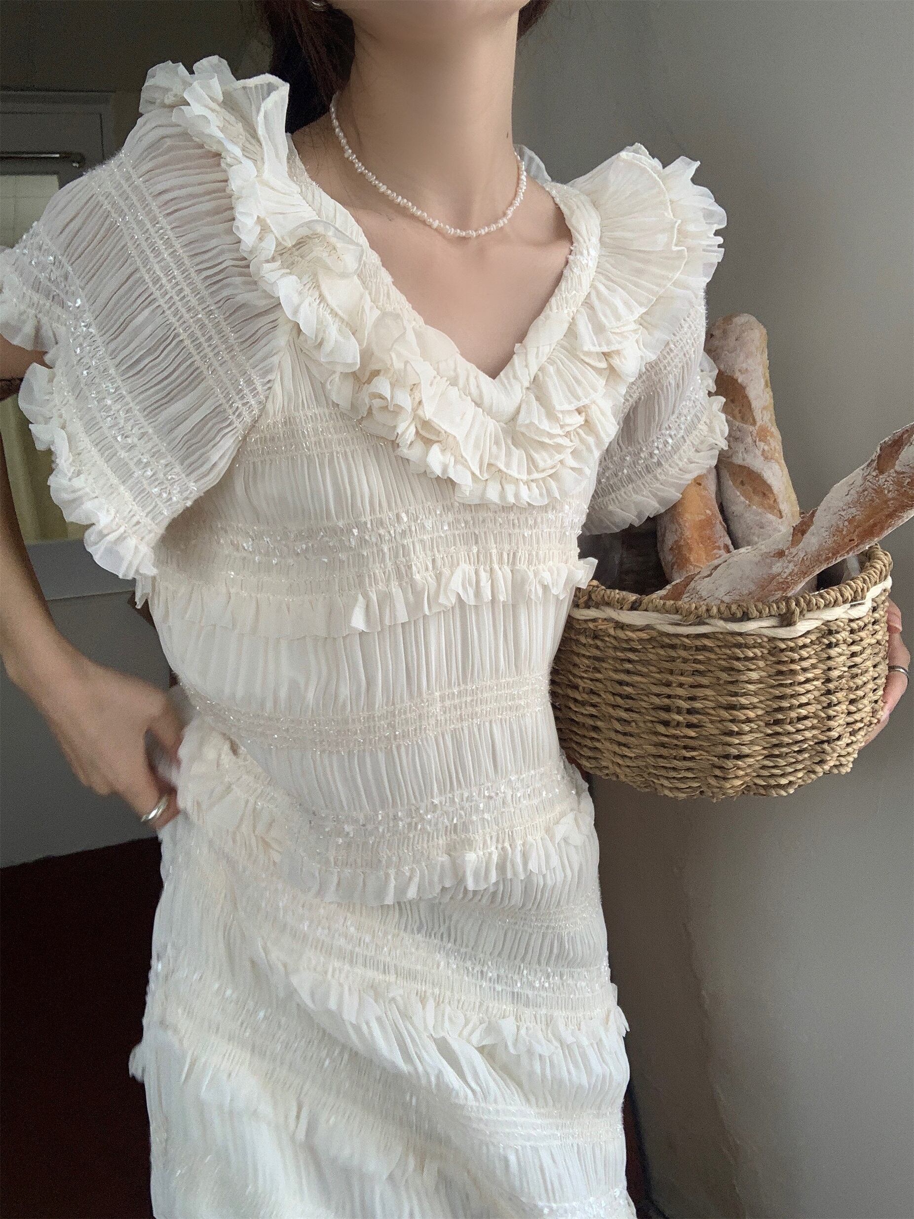 Gentle style temperament V-neck dress female 2022 summer new design ruffled mid-length fairy skirt サマー 夏物 スカート Vネック 092192123842509