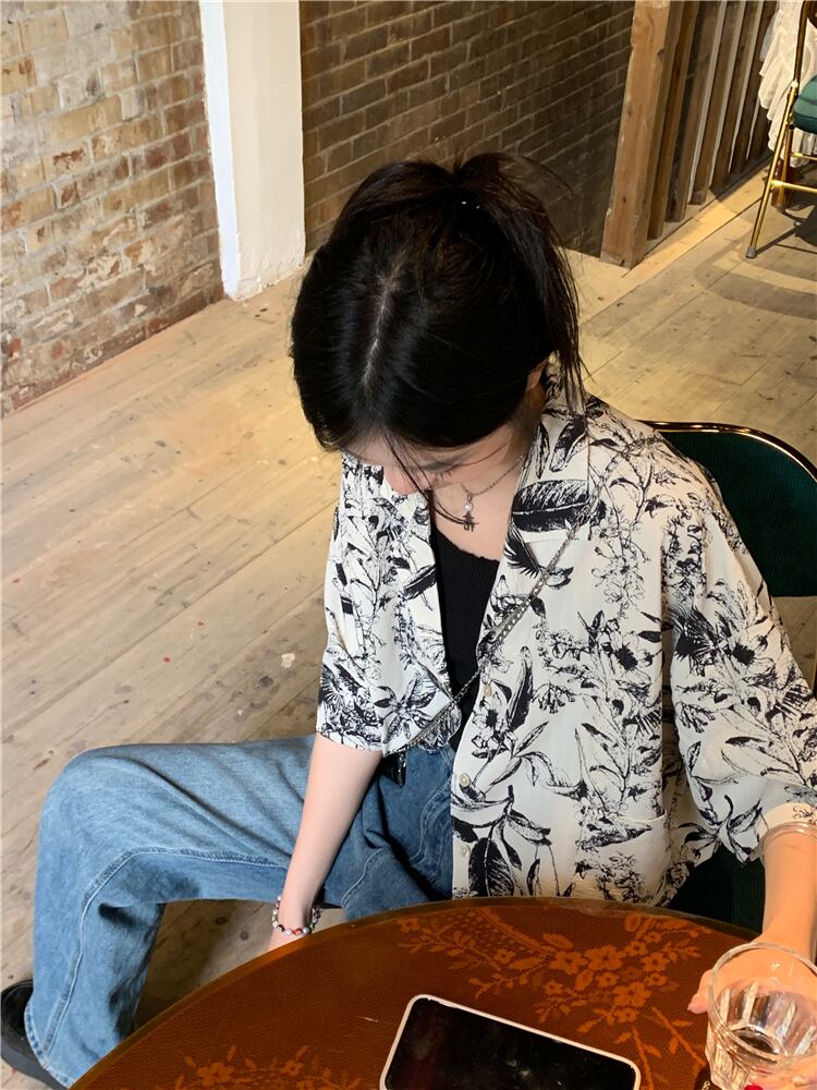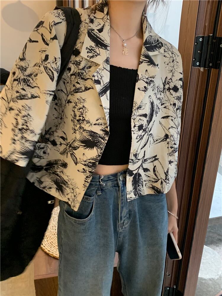 Retro ink print shirt women's summer 2022 new design niche suit collar loose short top trendy ショート レトロ サマー 夏物 0921944354144569