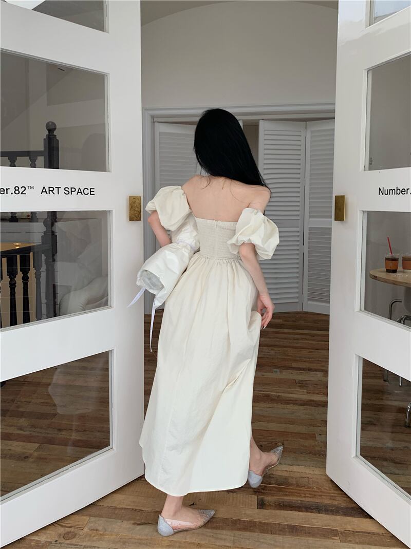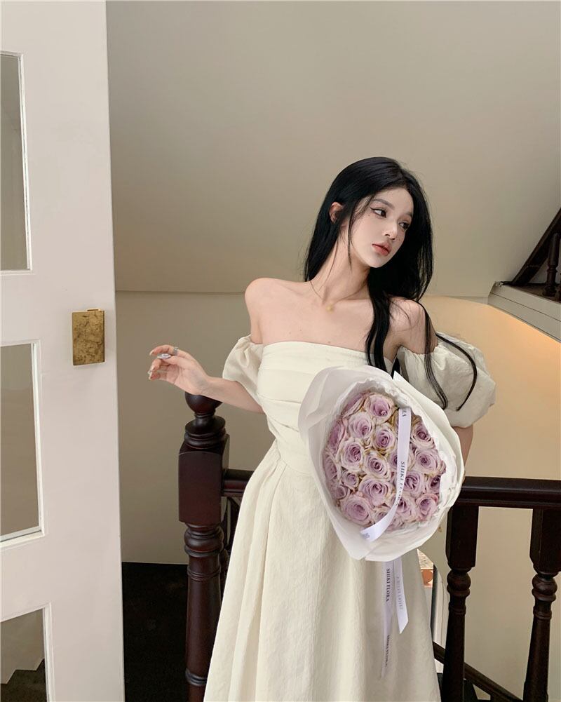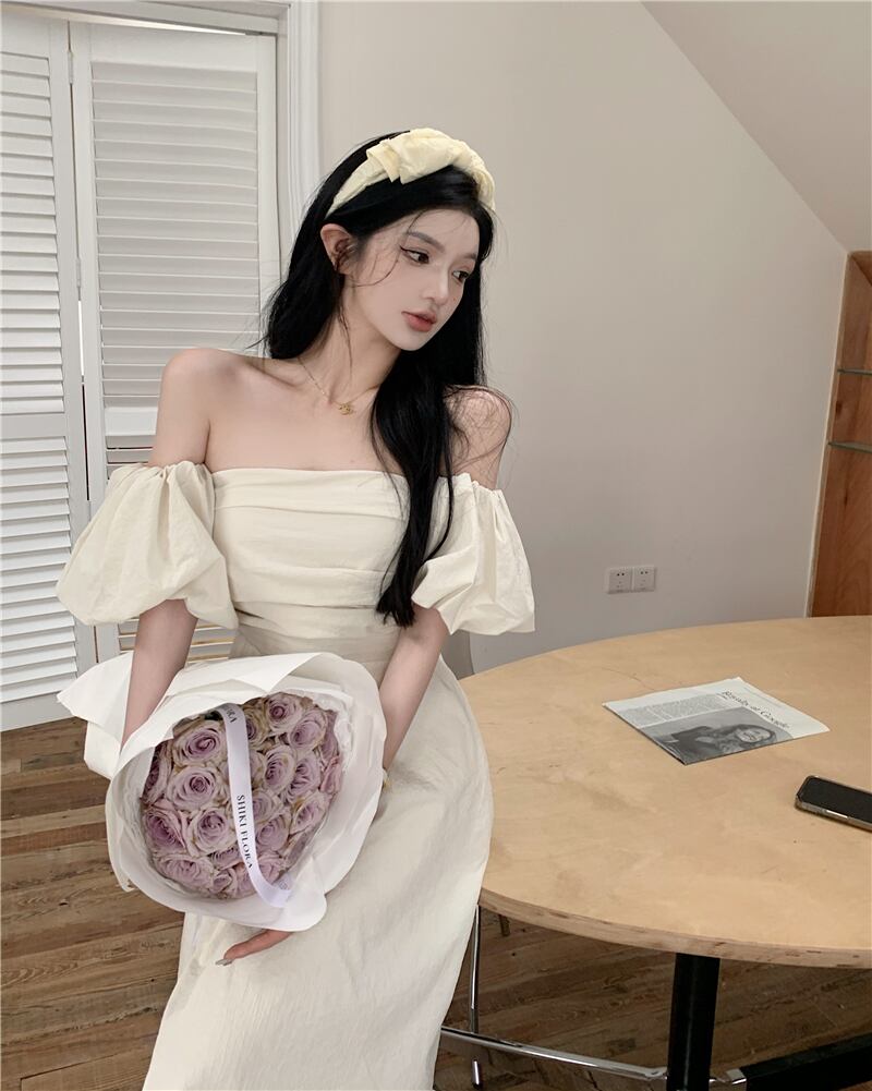 French temperament one-shoulder puff sleeve dress women's summer 2022 new gentle wind pleated waist A-line skirt プリーツ サマー 夏物 スカート Aライン 0921935050230083