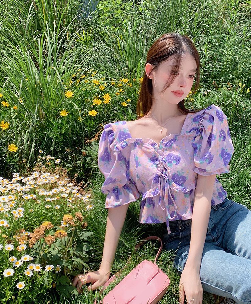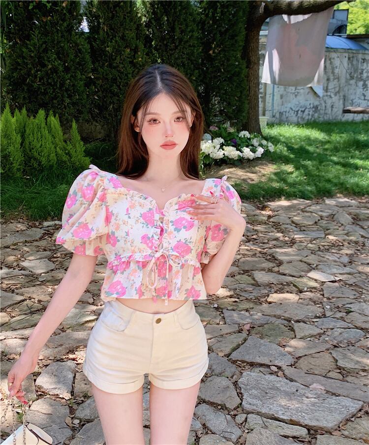 French sweet floral shirt women's summer 2022 new fungus edge tie waist puff sleeve short top trendy ショート 大人ガーリー スウィート キュート カジュアル サマー 夏物 花柄 0921945752943878