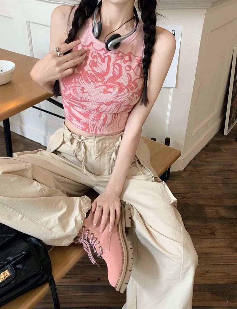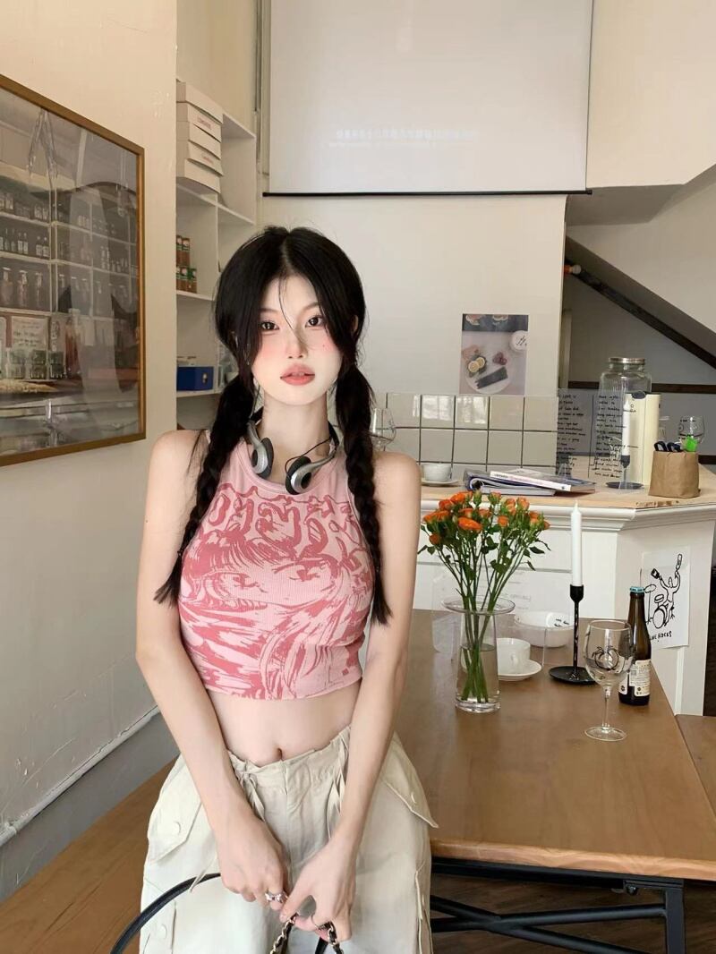 Sweet Spice Girl Sense Comic Print Sleeveless Vest Summer 2022 Slim Short Outer Top Trend ショート 大人ガーリー スウィート キュート カジュアル サマー 夏物 ノースリーブ スリム 0921913912161478
