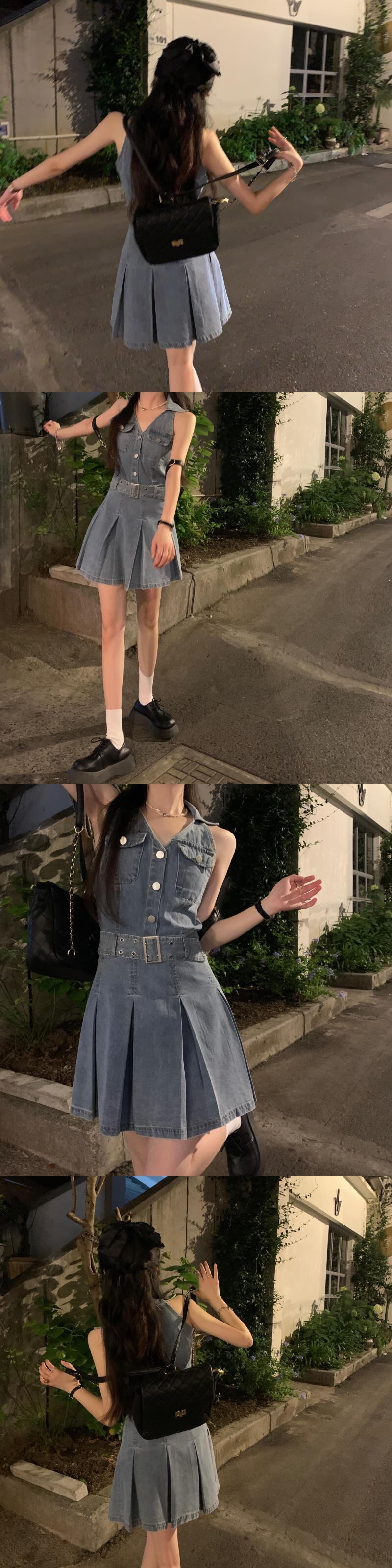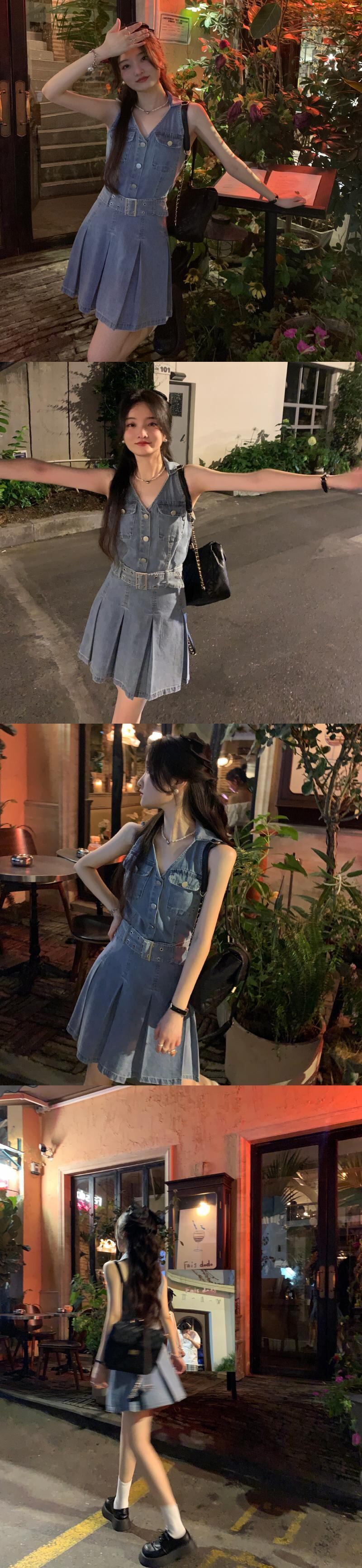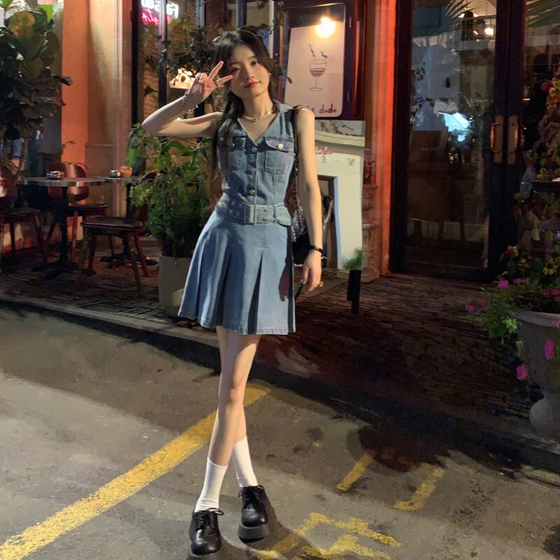 sense pure desire sleeveless denim dress female summer 2022 new temperament waist pleated skirt skirt プリーツ サマー 夏物 ノースリーブ スカート ピュア 0921977448434716