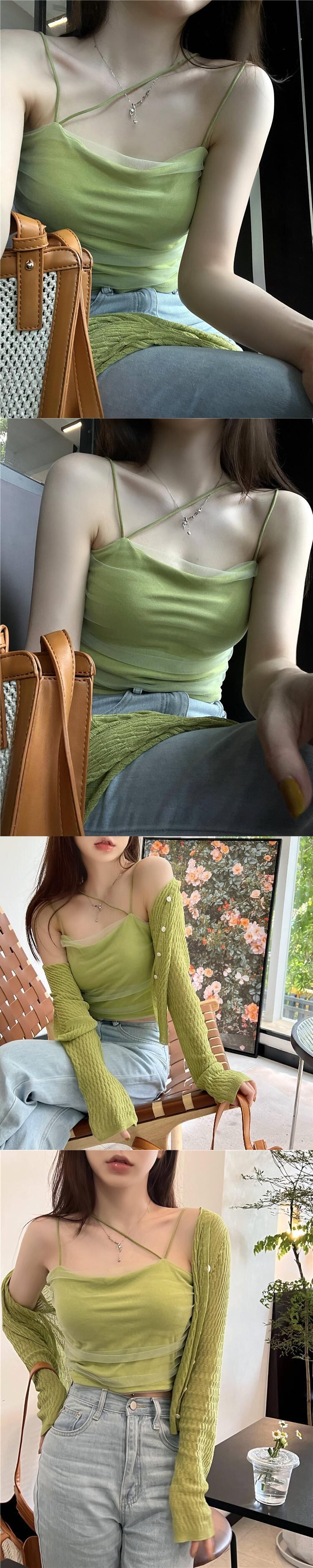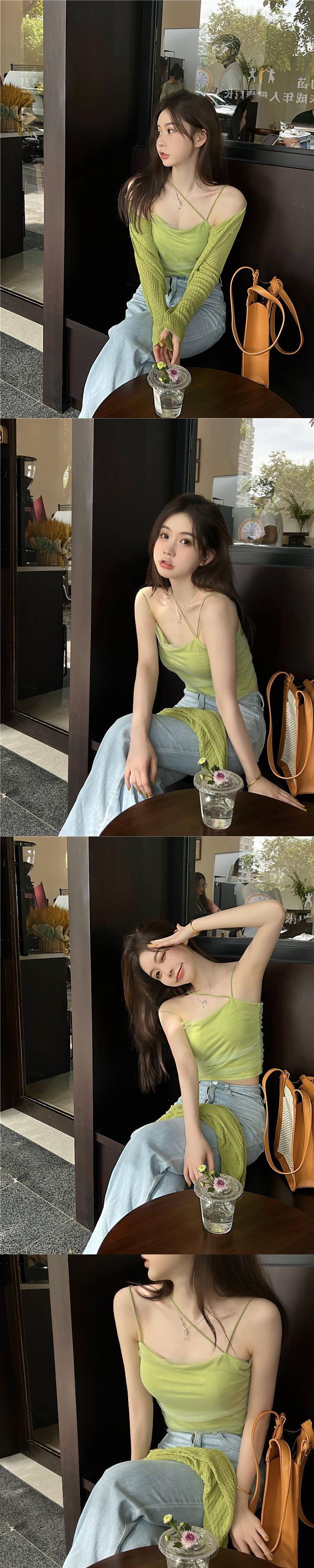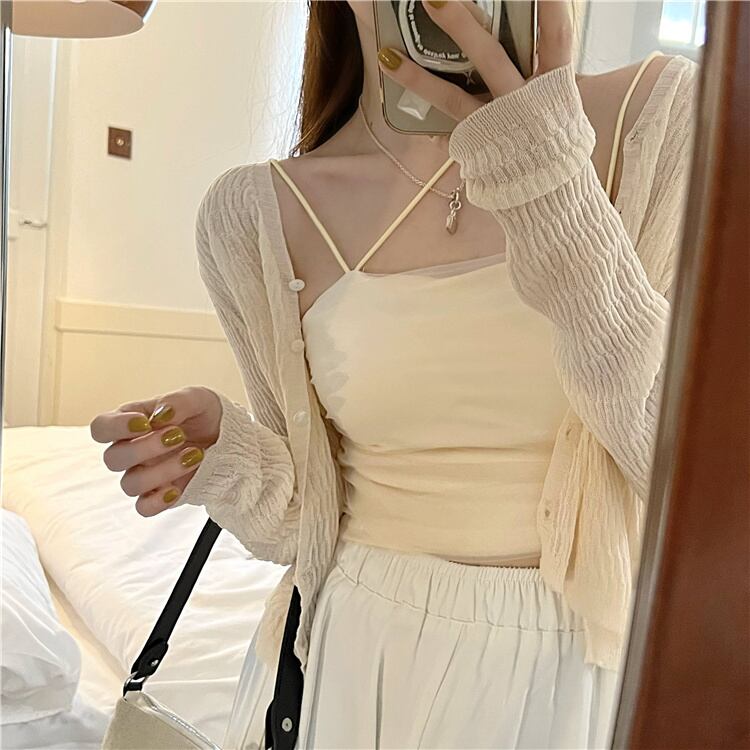Pure desire gentle temperament chic suit female summer 2022 new mesh stitching sling knitted cardigan two-piece set カーディガン サマー 夏物 メッシュ ステッチ 0921954437509437