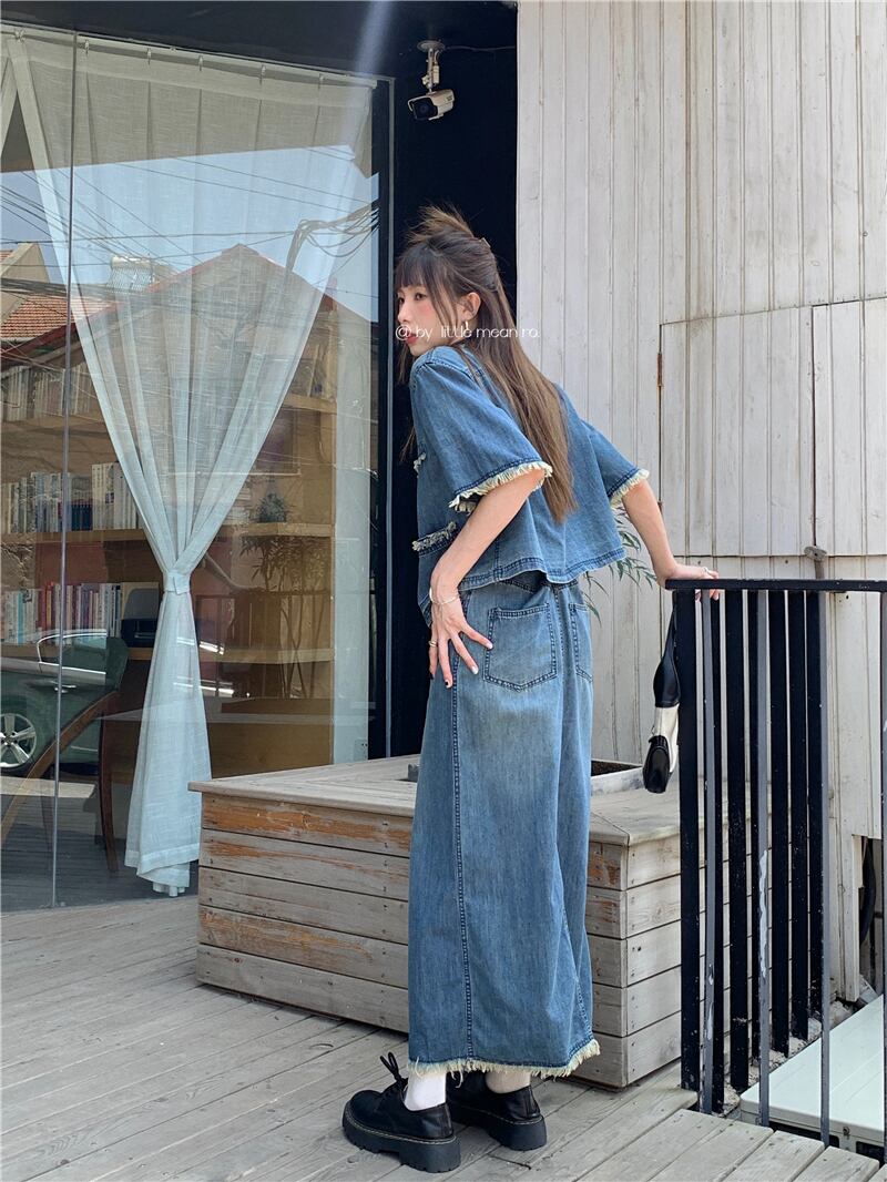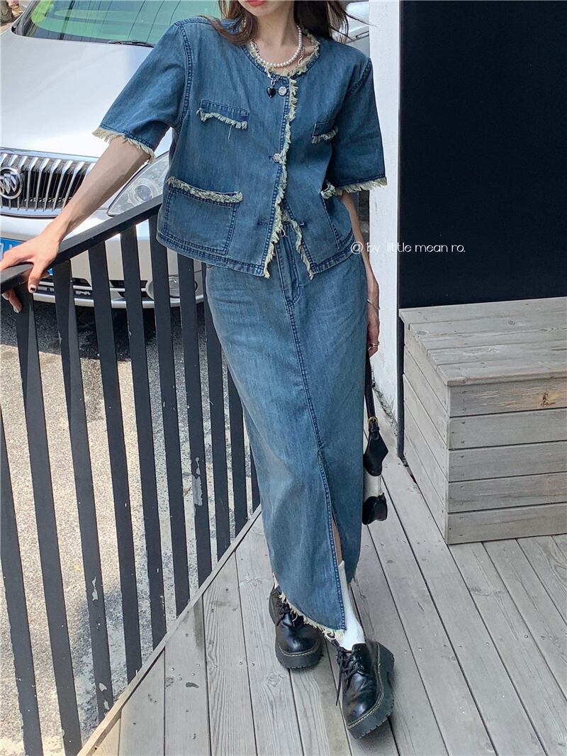 Xiaoxiang wind denim suit blouse jacket top slit skirt summer new fashion skirt two-piece set ブラウス サマー 夏物 スカート 0921966644242175