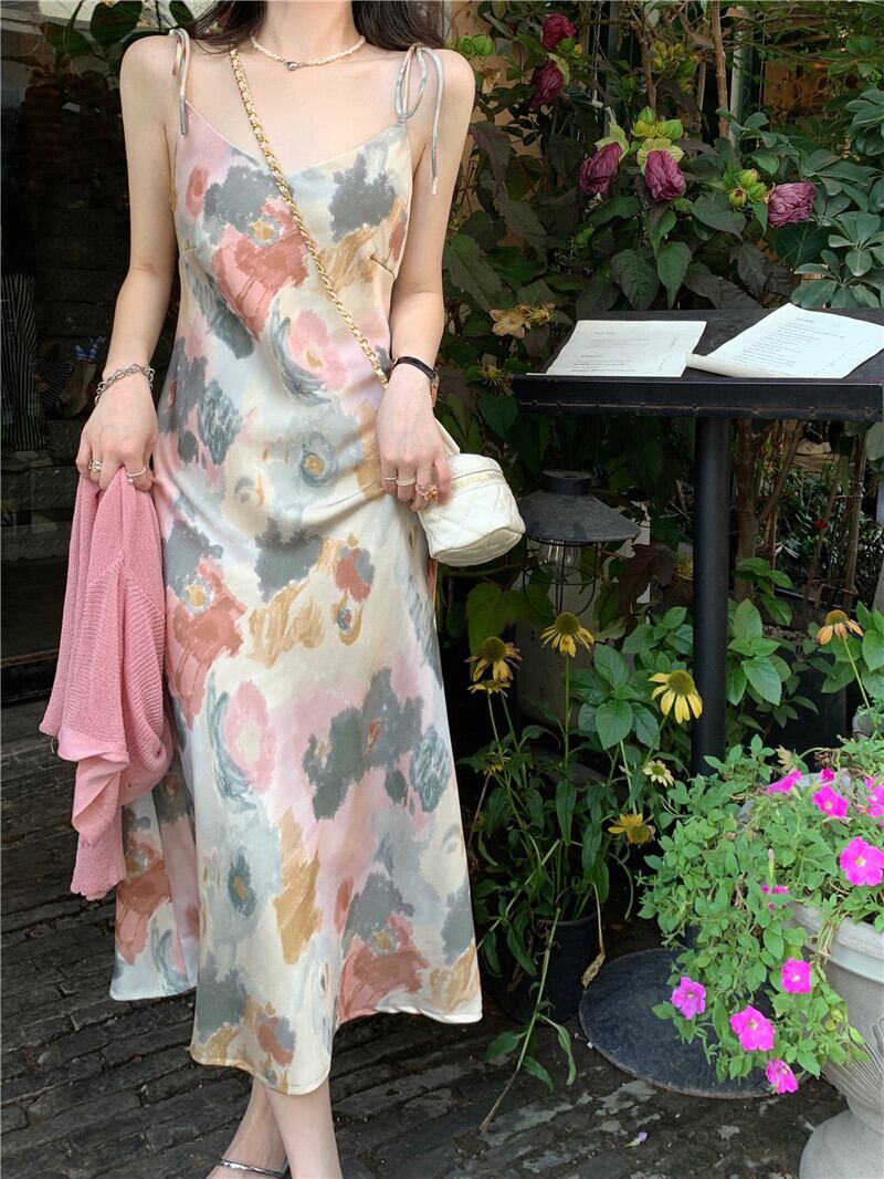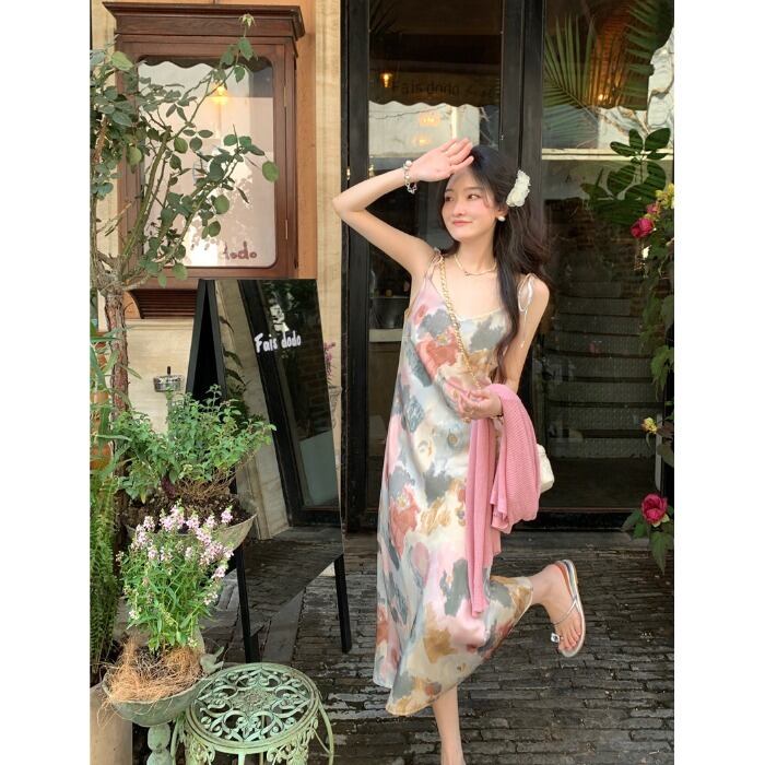 French retro oil painting suspender dress female summer 2022 new temperament V-neck design mid-length skirt レトロ サマー 夏物 スカート Vネック 0921962453225278