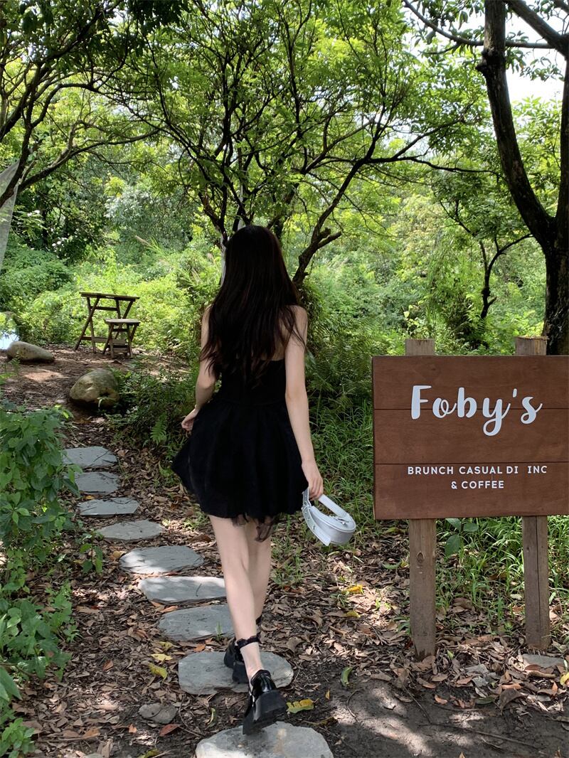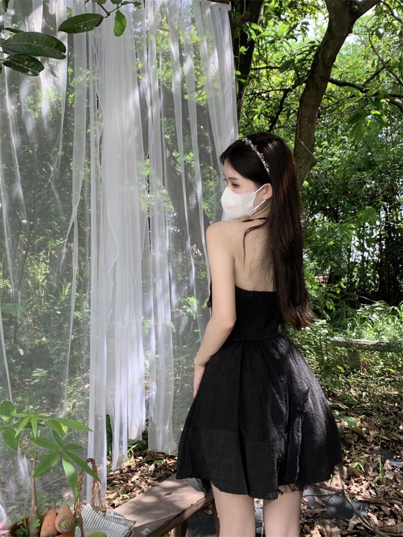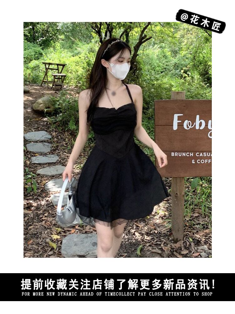 Pure desire mesh stitching black halter dress women's summer 2022 new temperament backless waist puffy skirt ブラック サマー 夏物 メッシュ スカート ステッチ 0921974378374497
