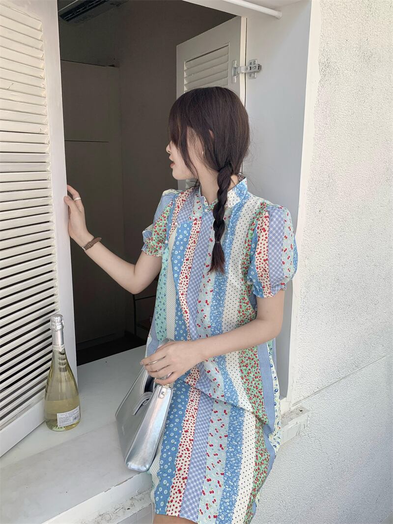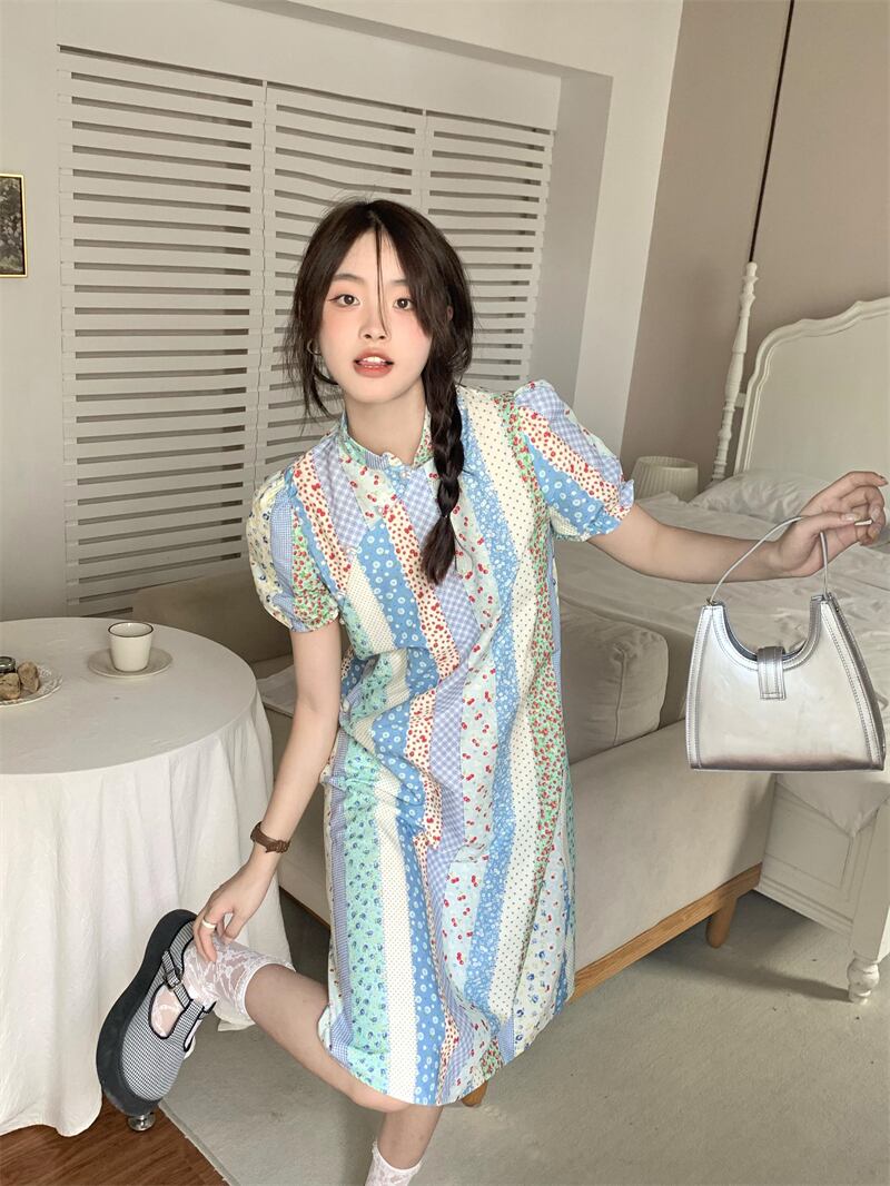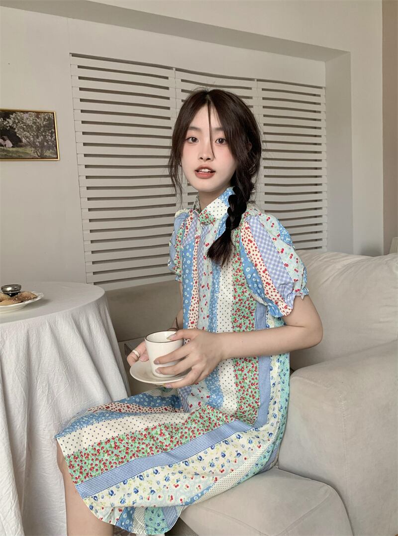 Improved cheongsam gentle stitching floral dress female summer 2022 new sweet loose A-line skirt ins 大人ガーリー スウィート キュート カジュアル サマー 夏物 花柄 スカート Aライン ステッチ 0921991154212322
