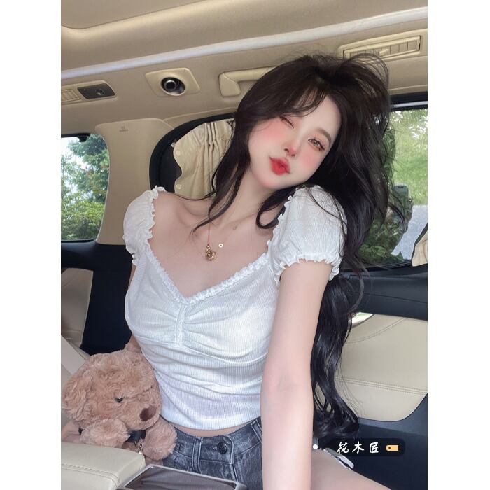 Pure Desire Hot Girl V-neck knitted short-sleeved T-shirt women's summer thin section 2022 new sexy slim short sweet and spicy top ショート 大人ガーリー スウィート キュート カジュアル サマー 夏物 Vネック スリム Tシャツ 0921978823033825