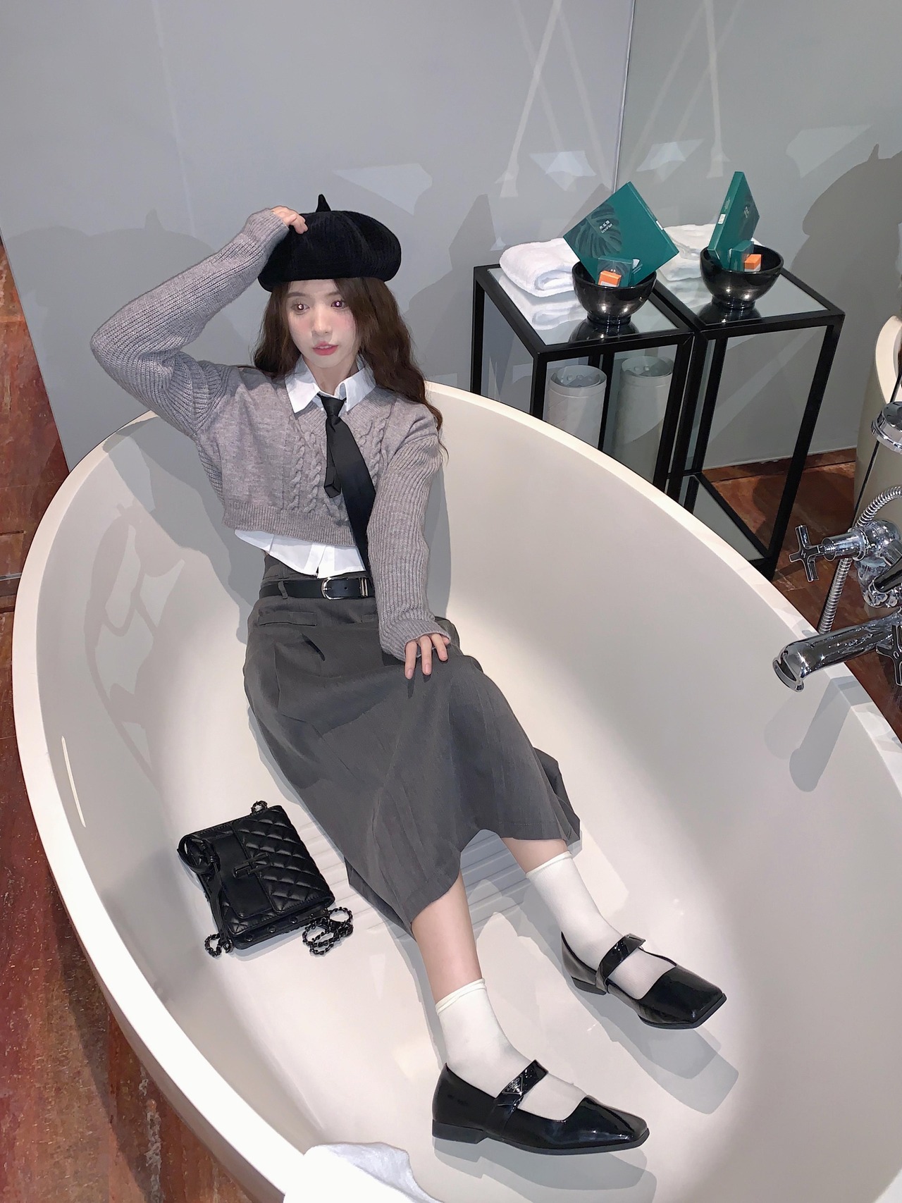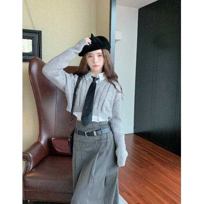 色:ホワイトshirt+tie,グレーsweatersinglepiece,グレースカート+ベルト