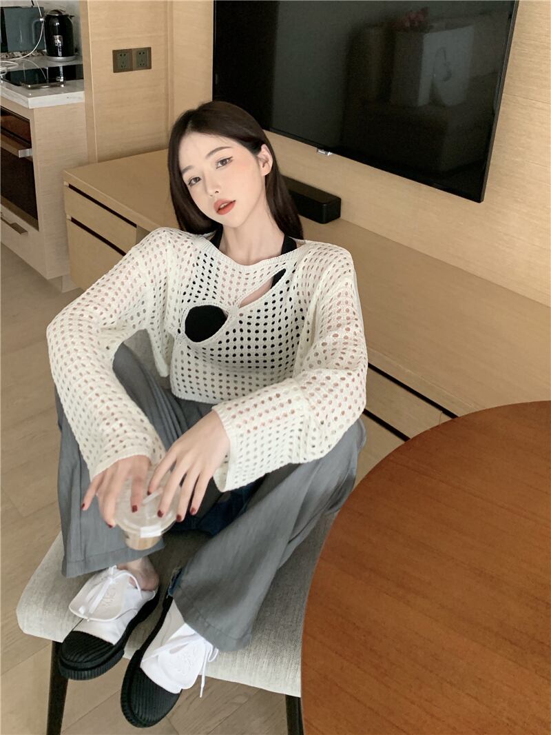Hot chic hollow white sunscreen sweater women's autumn 2022 new design loose short top trendy ショート ホワイト オータム 秋物 0921987552024312