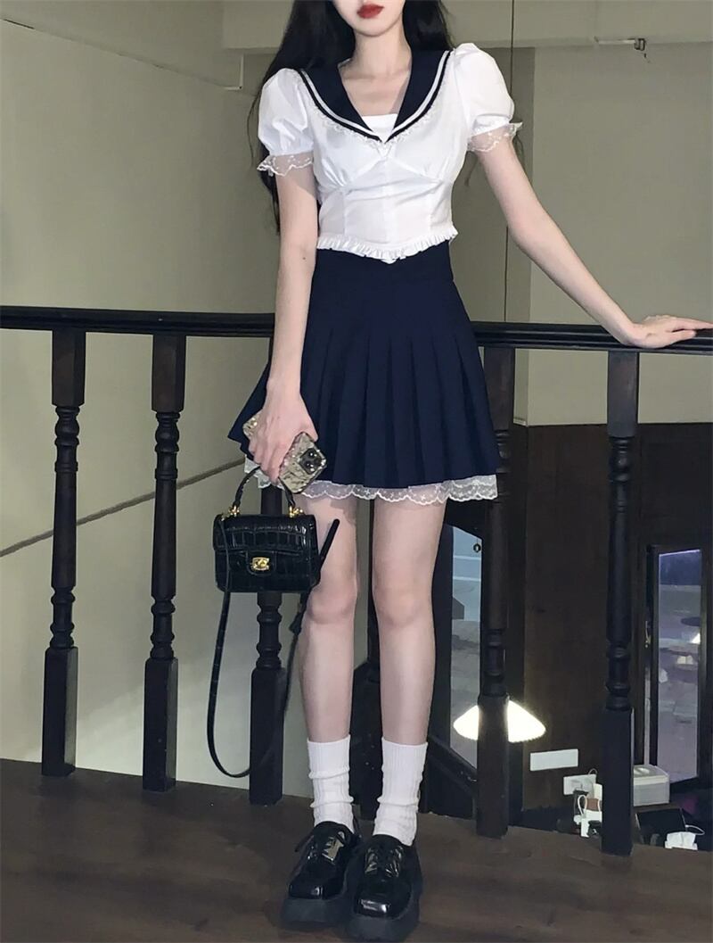 Sweet and spicy navy collar white shirt women's summer 2022 new lace edge waist short puff sleeve top trendy ショート ホワイト レース 大人ガーリー スウィート キュート カジュアル サマー 夏物 0921990160002635