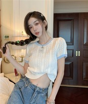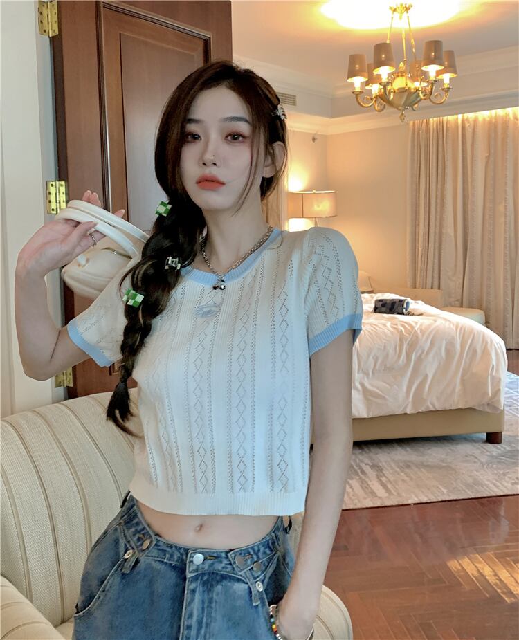 Sweet age-reducing contrast color hollow thin section short-sleeved T-shirt women's summer 2022 new slim short round neck top ショート 大人ガーリー スウィート キュート カジュアル サマー 夏物 Oネック スリム Tシャツ 0921926327818802
