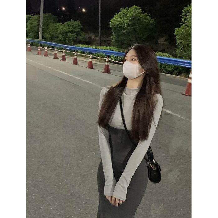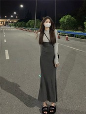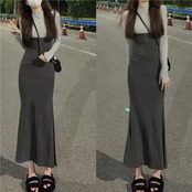 高品質の気質ストラップ フィッシュテール ドレス スーツ女性の秋ハーフ ハイネック長袖ボトムス シャツ トップ 2 点セット ロング オータム 秋物 0921919722728690