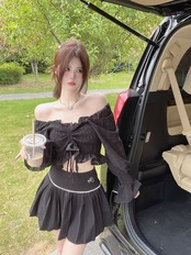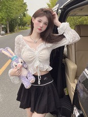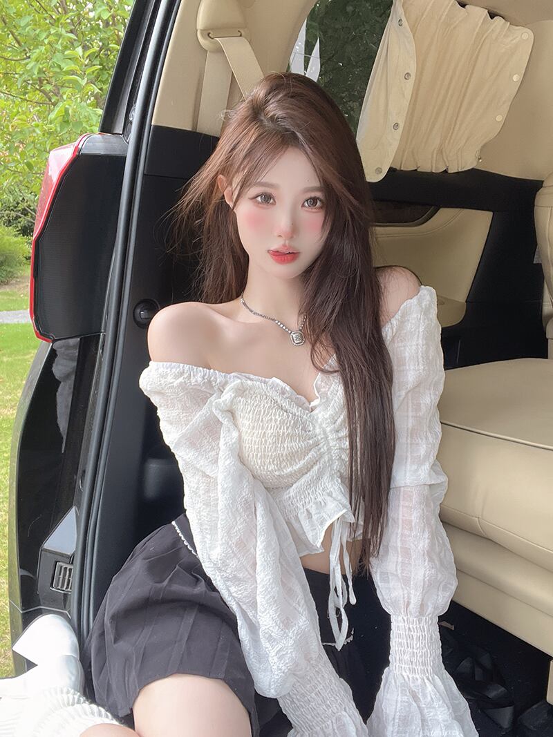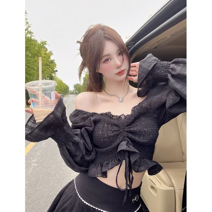 French pure desire one-shoulder white shirt women's autumn thin long-sleeved ruffled slim short super fairy top ショート ロング ホワイト オータム 秋物 スリム ピュア 0921993491859855