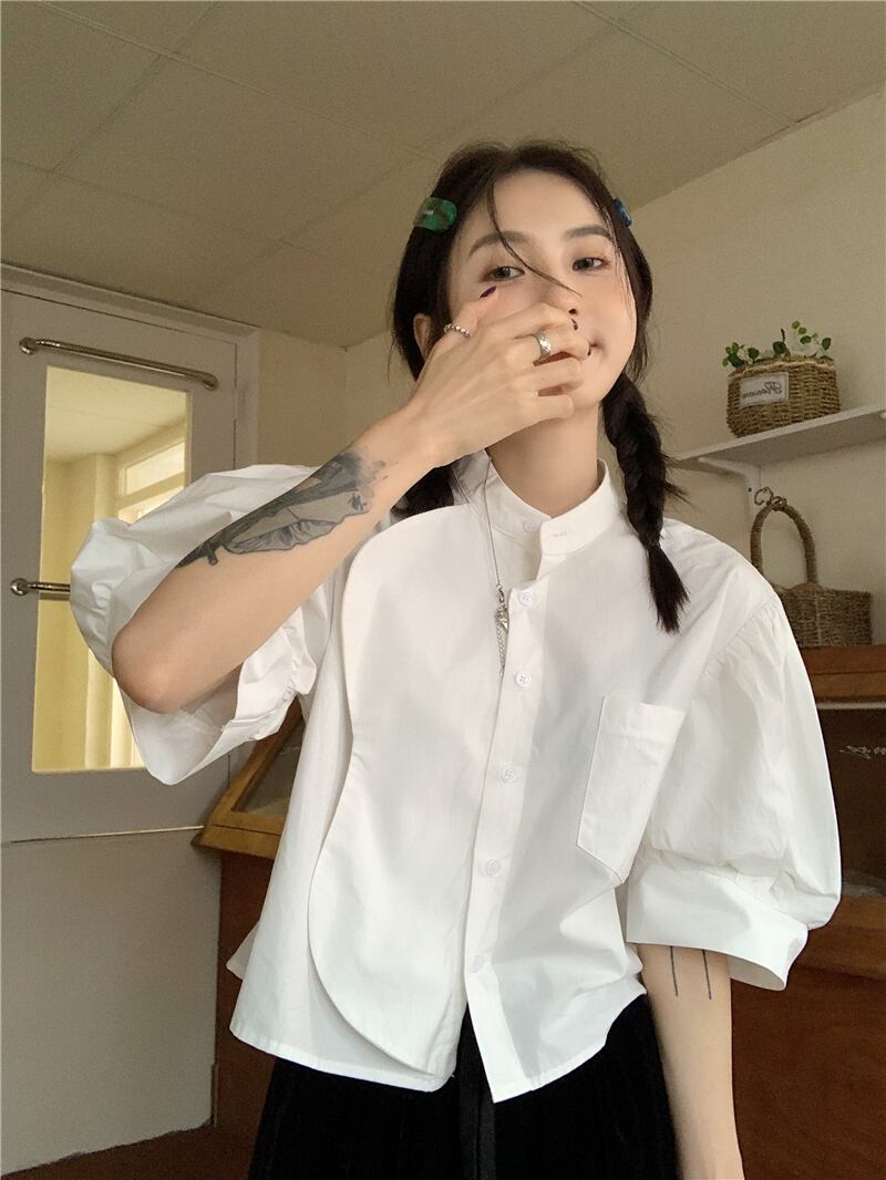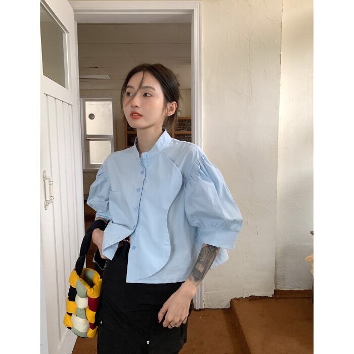 style fashion stand-up collar puff-sleeve shirt women's early autumn 2022 new design short loose loose thin top ショート オータム 秋物 0921980085525111