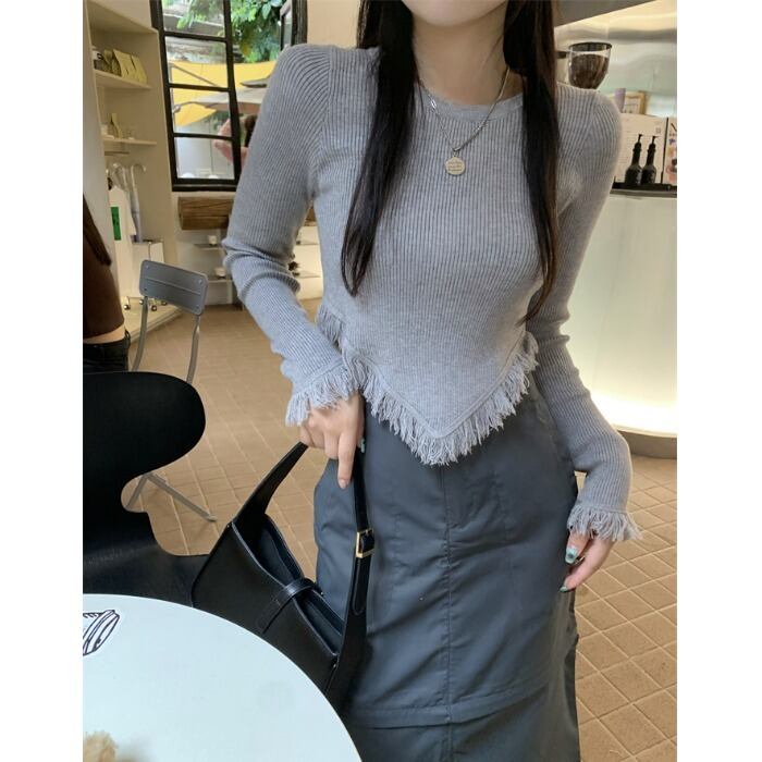 Irregular design tel gray long-sleeved sweater women's autumn 2022 new chic temperament short top ショート ロング オータム 秋物 0921993995966323