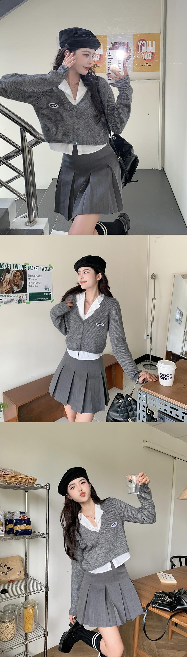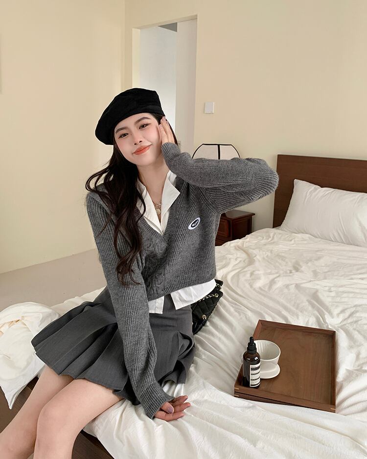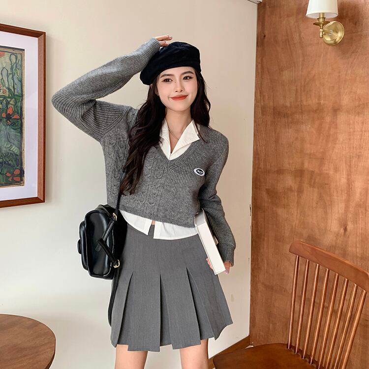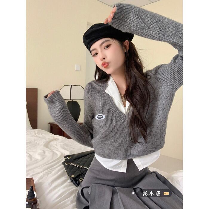 sense chic fake two-piece stitching college style V-neck sweater women's autumn 2022 new style short top ショート オータム 秋物 Vネック ステッチ 0921957745107384