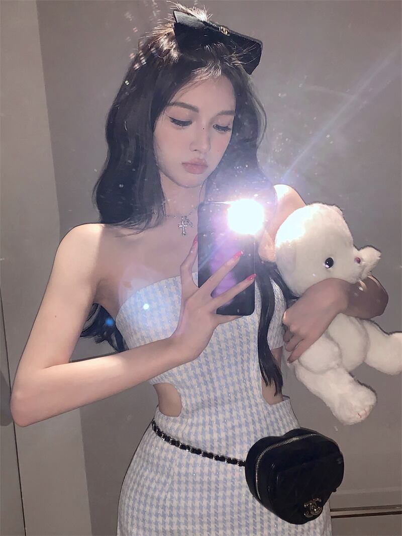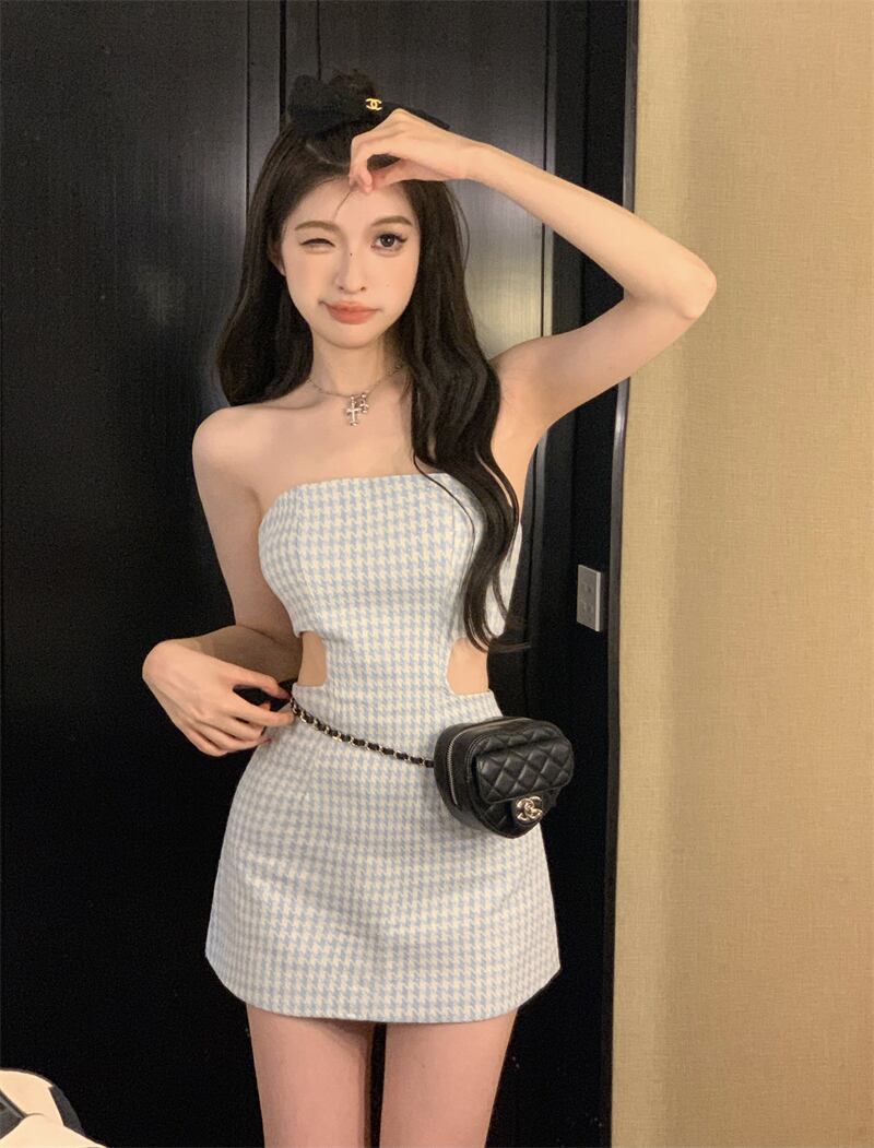 Hot sexy hollow houndstooth tube top dress female summer 2022 new chic temperament waist bag hip skirt サマー 夏物 スカート 0921942239154506