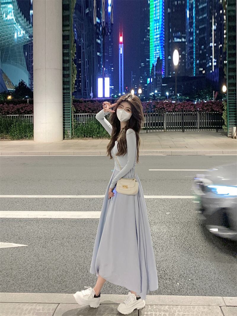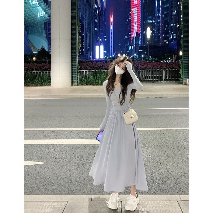 sense niche gentle long-sleeved dress women's autumn 2022 new version of the simple temperament waist A-line skirt ロング オータム 秋物 スカート Aライン 0921984166860727
