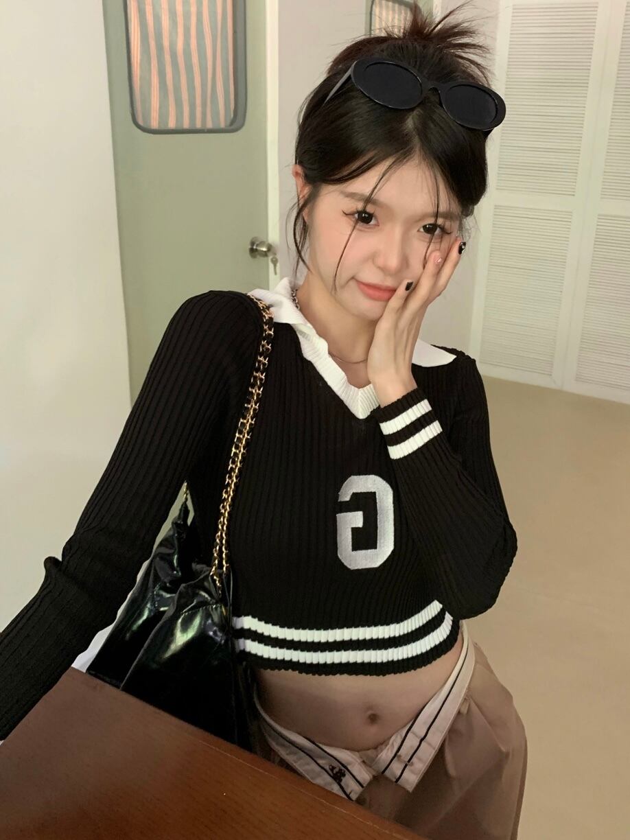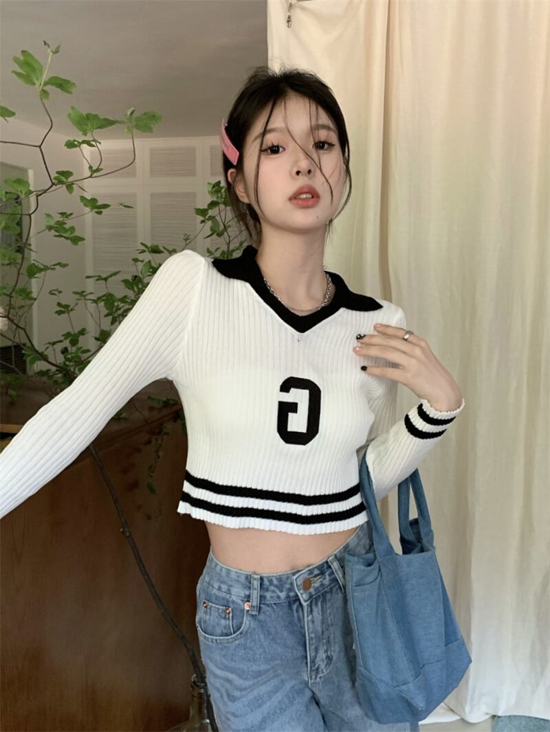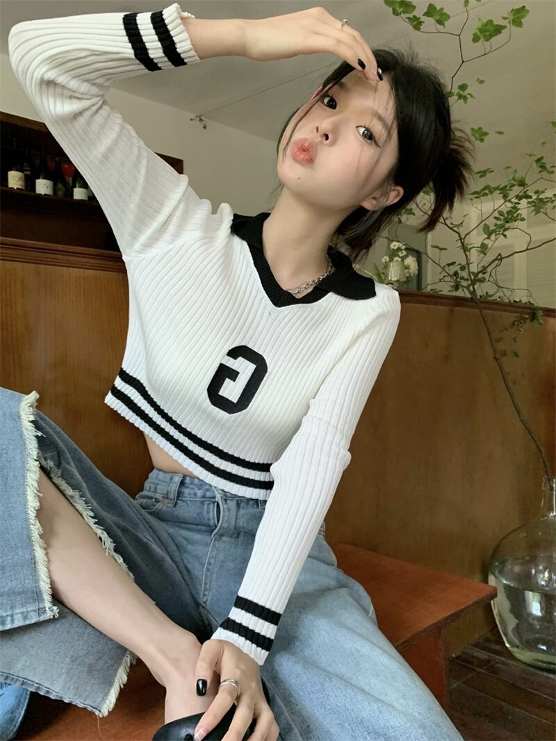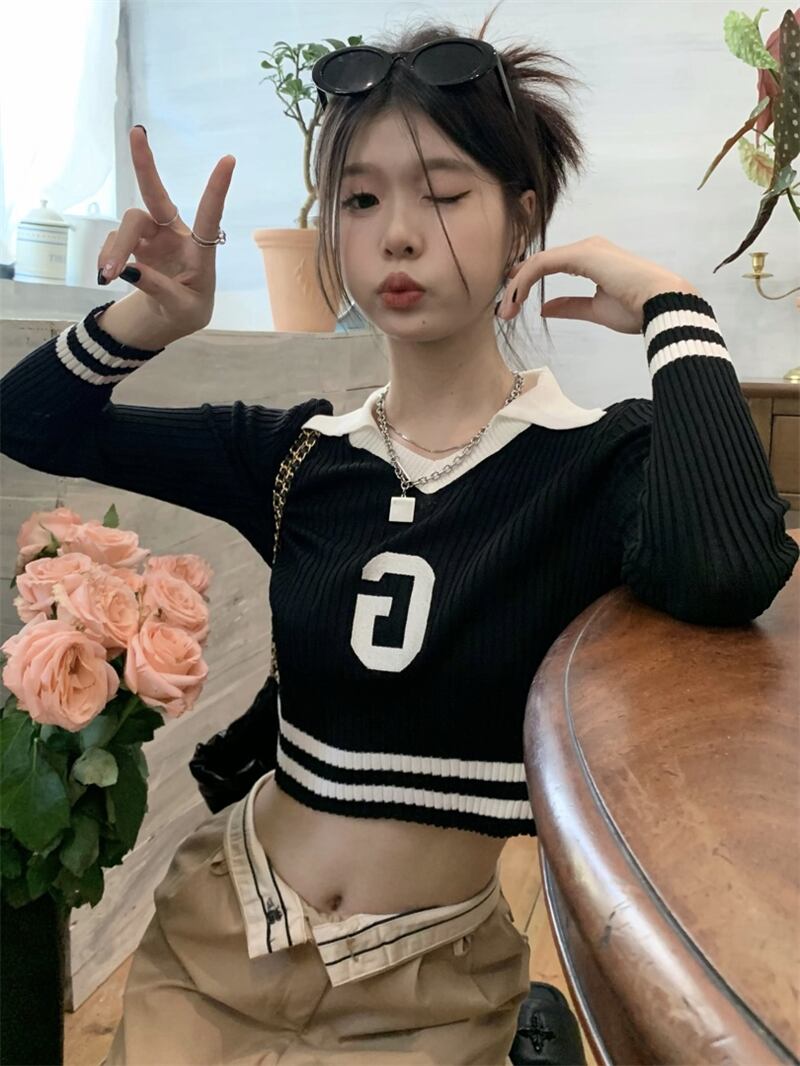 Hot chic hit color letter polo collar long-sleeved sweater women's autumn 2022 new temperament short top trend ショート ロング オータム 秋物 0921939841357543