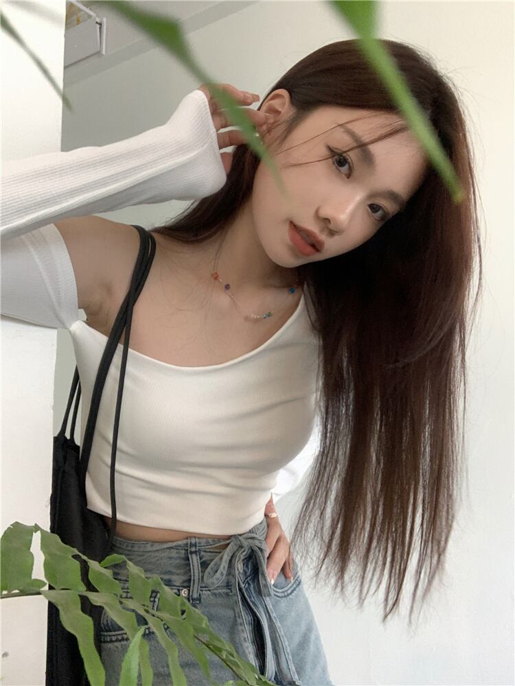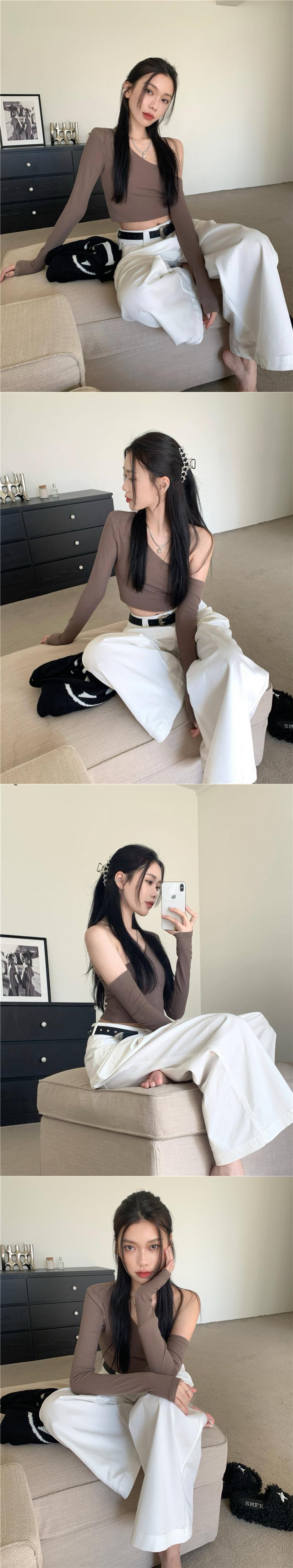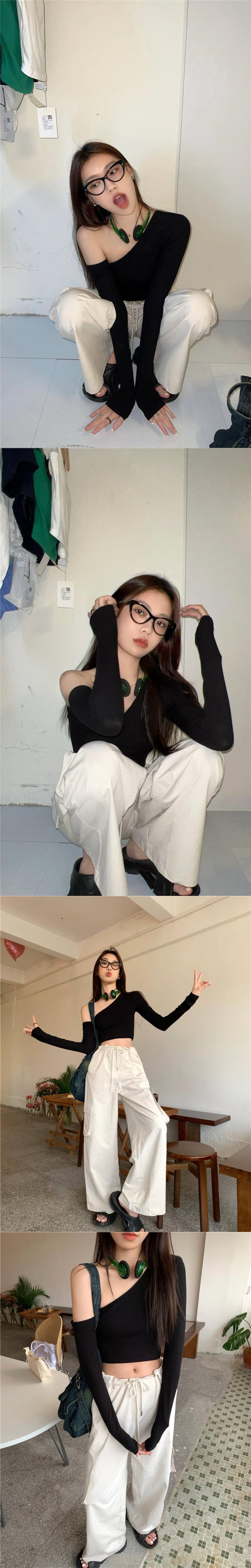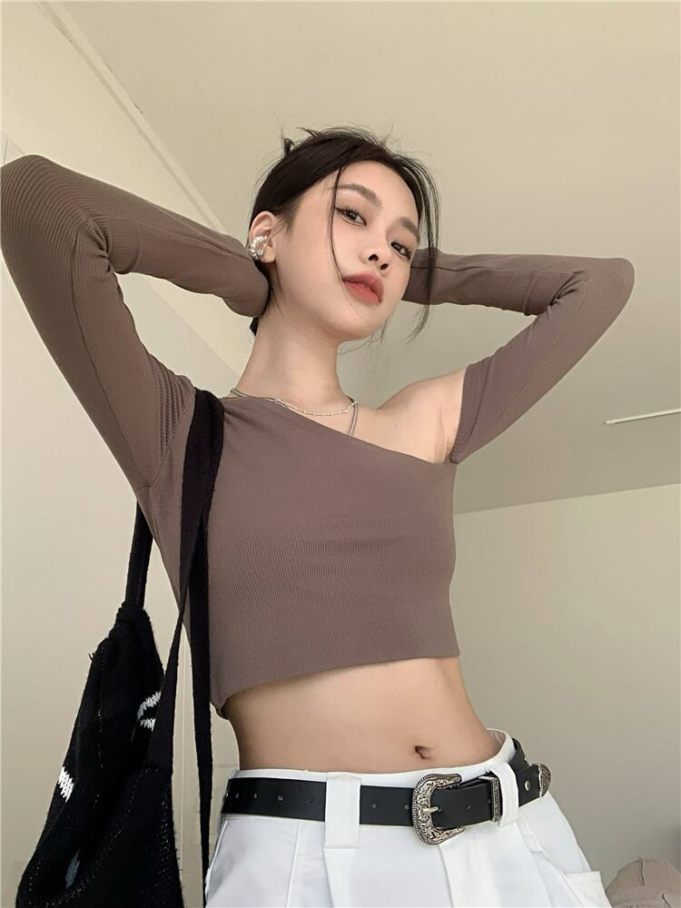 Hot temperament off-the-shoulder solid color long-sleeved T-shirt women's autumn 2022 new design chic slim short top ショート ロング オータム 秋物 スリム Tシャツ ソリッドカラー 0921934426803833