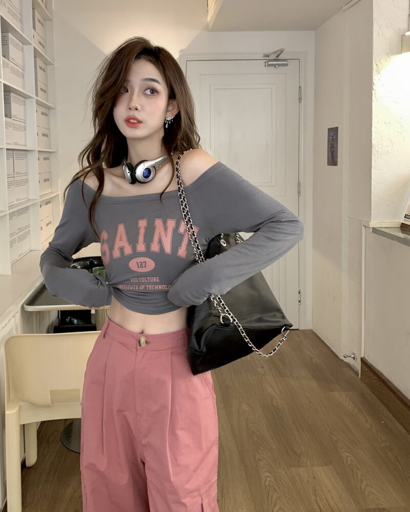 retro alphabet print one-shoulder T-shirt women's autumn 2022 new slim short long-sleeved pullover top ショート ロング レトロ オータム 秋物 スリム Tシャツ 0921916367901996