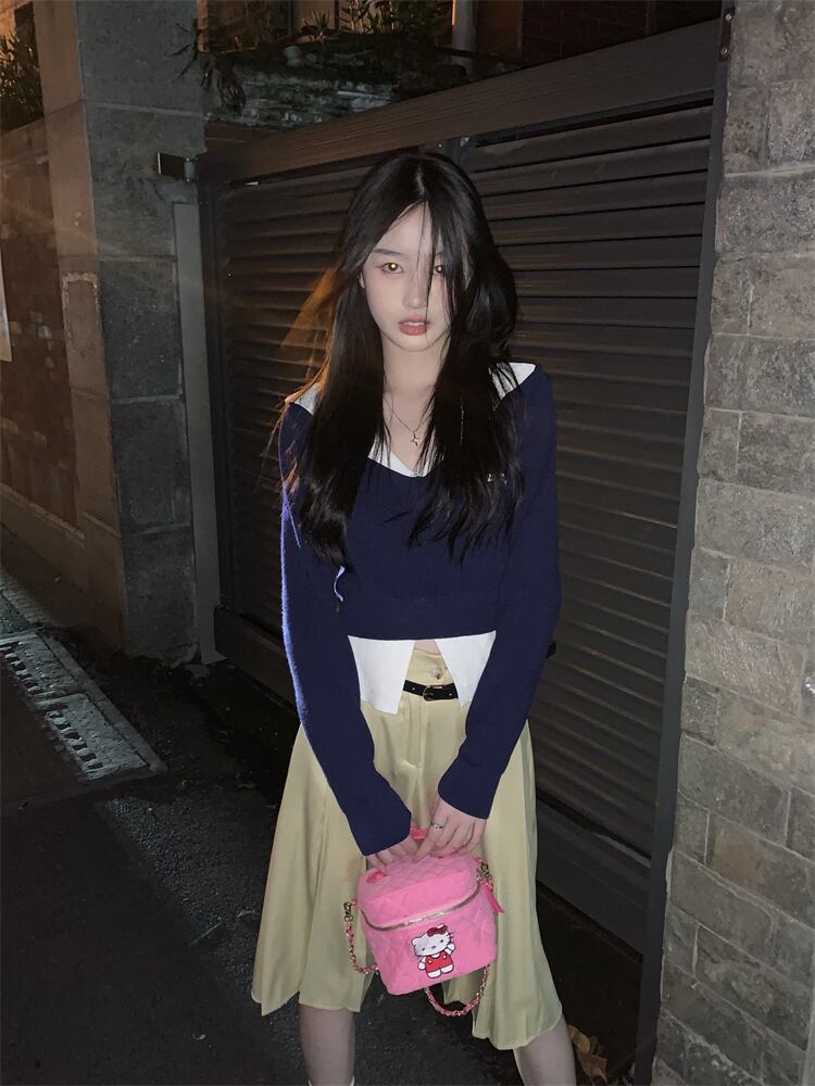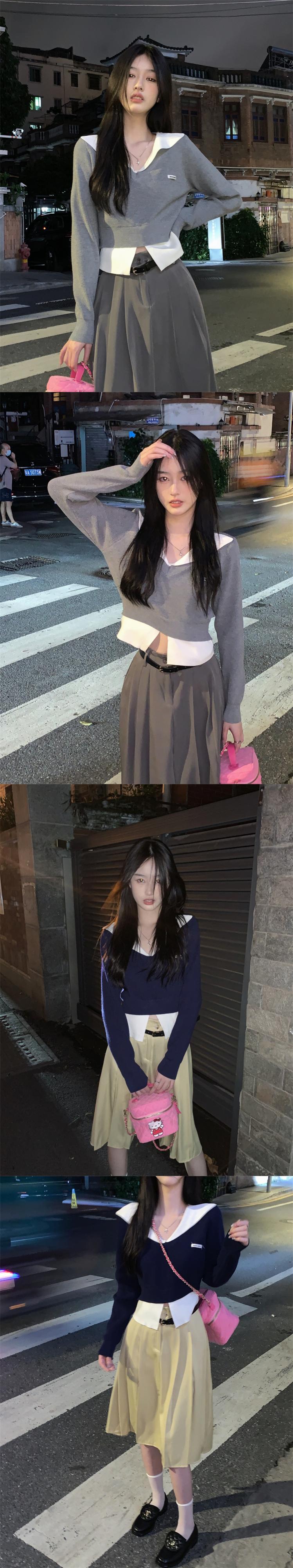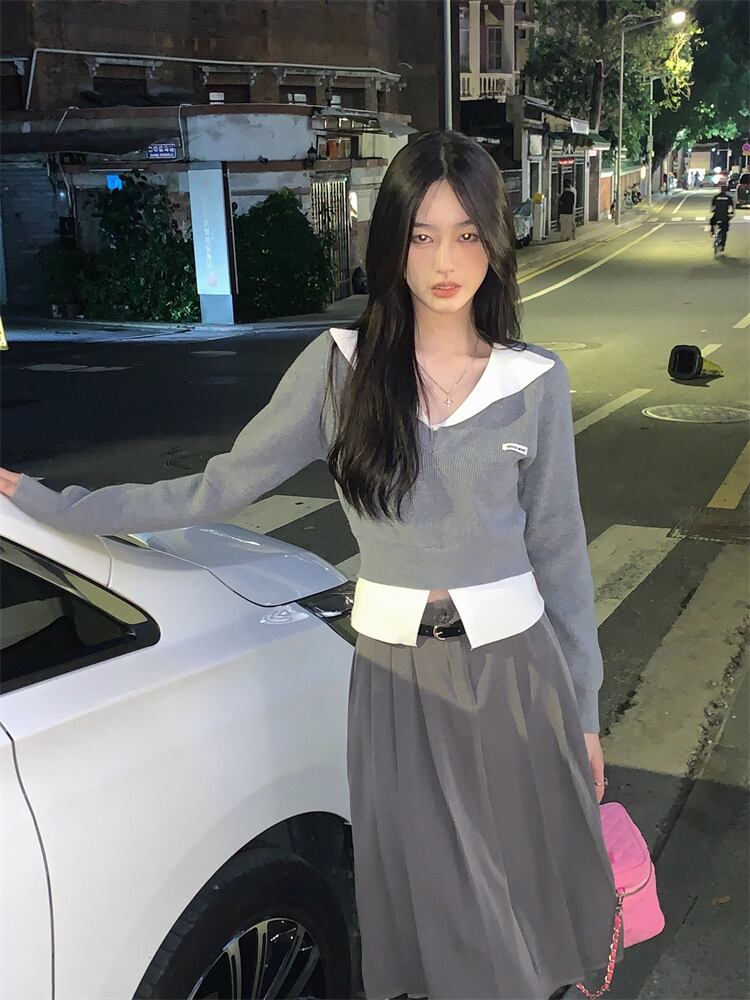 -quality lazy fake two-piece long-sleeved knitted sweater women's autumn 2022 new chic temperament thin short top ショート ロング オータム 秋物 0921946616414093