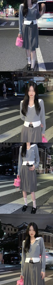 色:グレートップsinglepiece,ネイビーブルーshirt,グレーhalfスカートsinglepiece,Card色スカートワンpiece