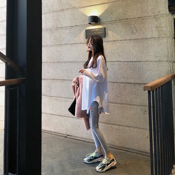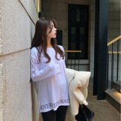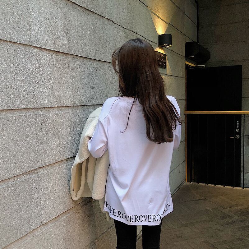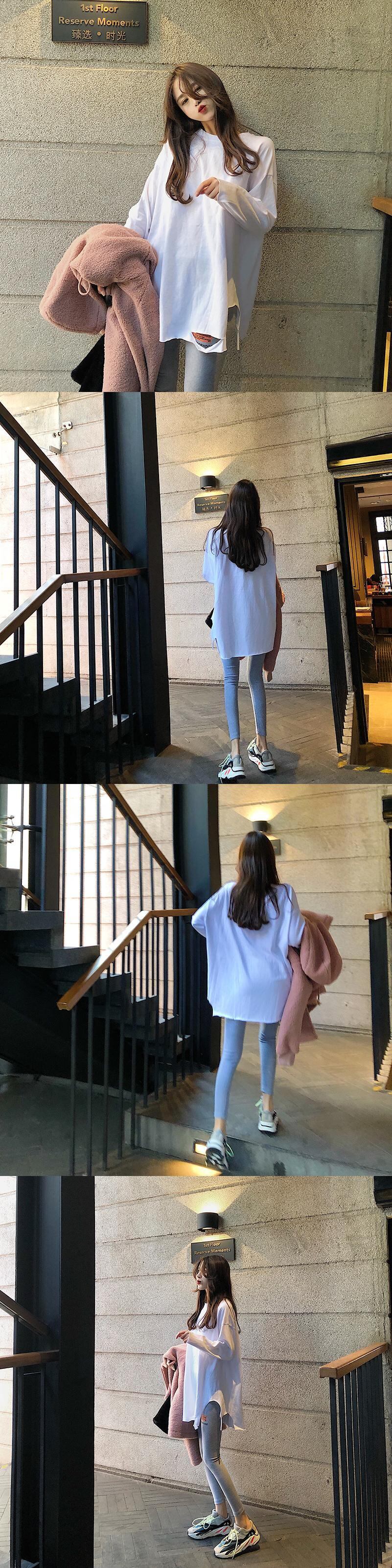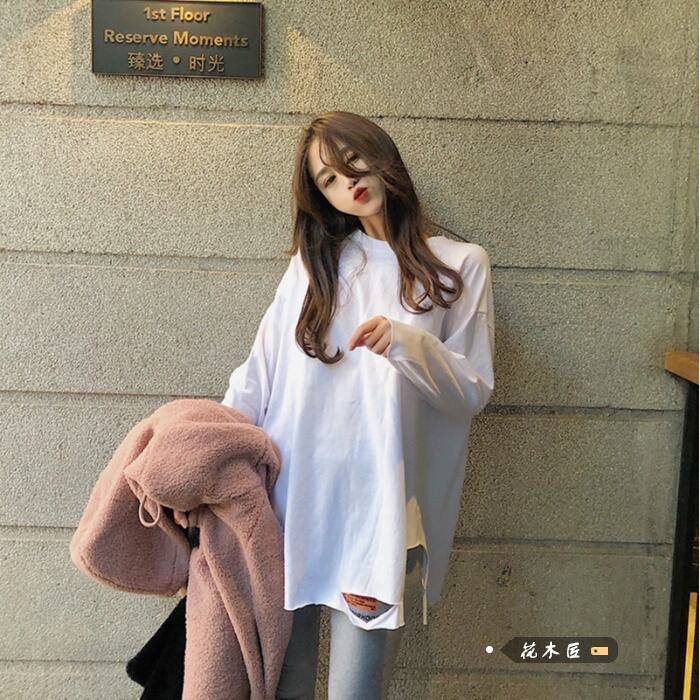 Lazy wind loose hole long-sleeved T-shirt women's autumn 2022 new version mid-length round neck bottoming shirt top ロング オータム 秋物 Oネック Tシャツ 0921999638574582