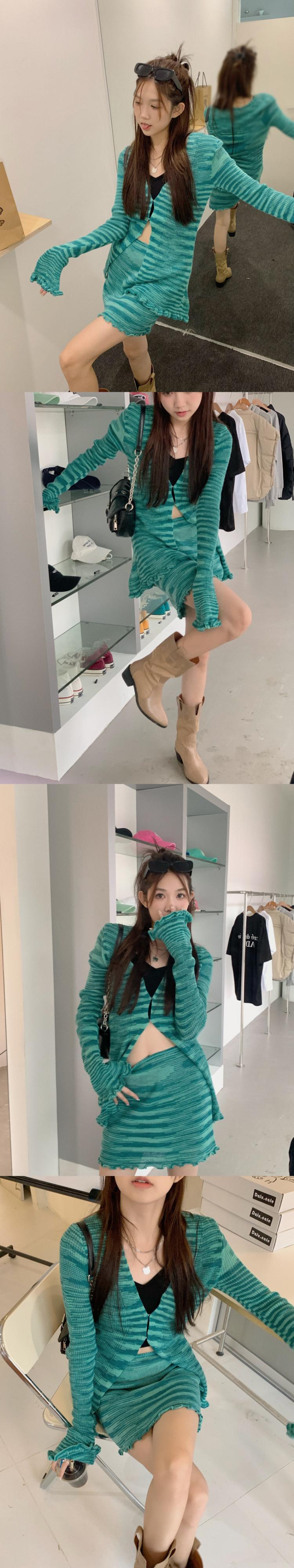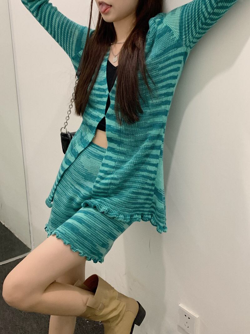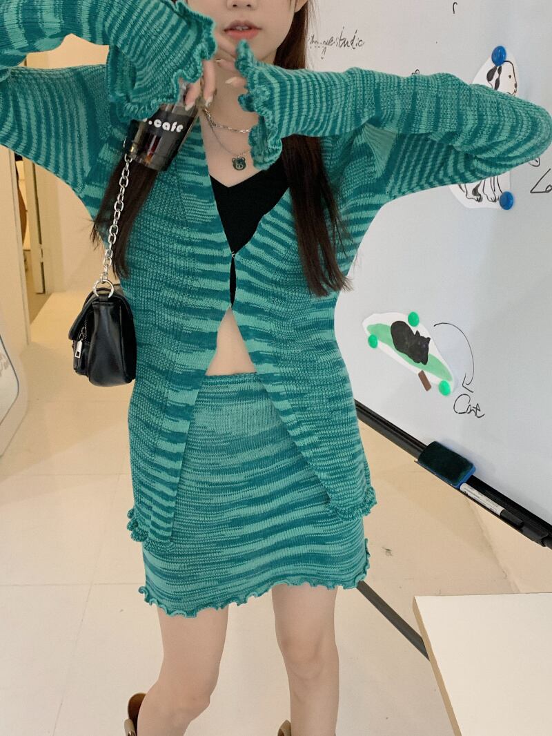 Hot autumn suit female green striped knitted cardigan fungus edge bag hip skirt fashion fried street two-piece set ストリート カーディガン オータム 秋物 スカート ストライプ グリーン 0921981381852059