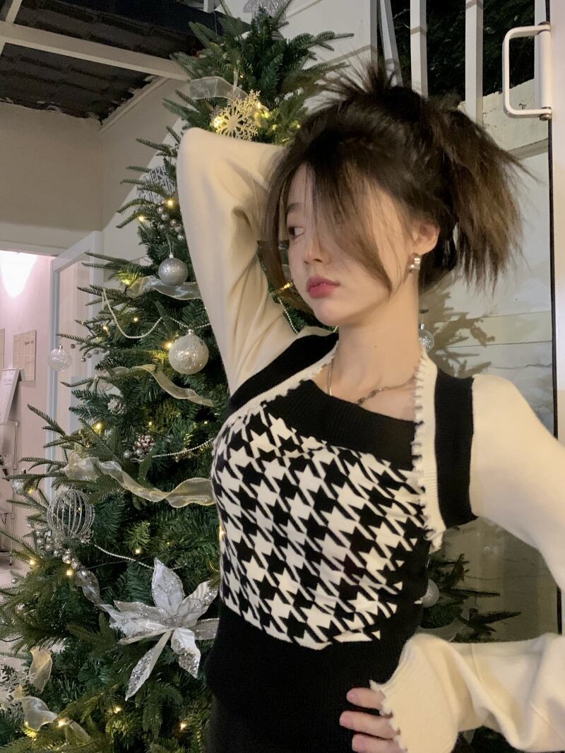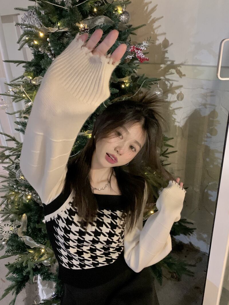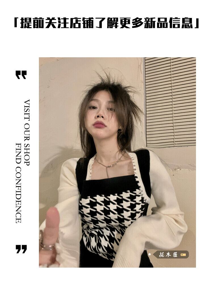 デザインセンスニッチフェイクツーピース長袖セーター女性の2022年秋の新しいフレンチ気質スクエアカラーチェック柄トップ ロング オータム 秋物 スクウェア 0921986043555782