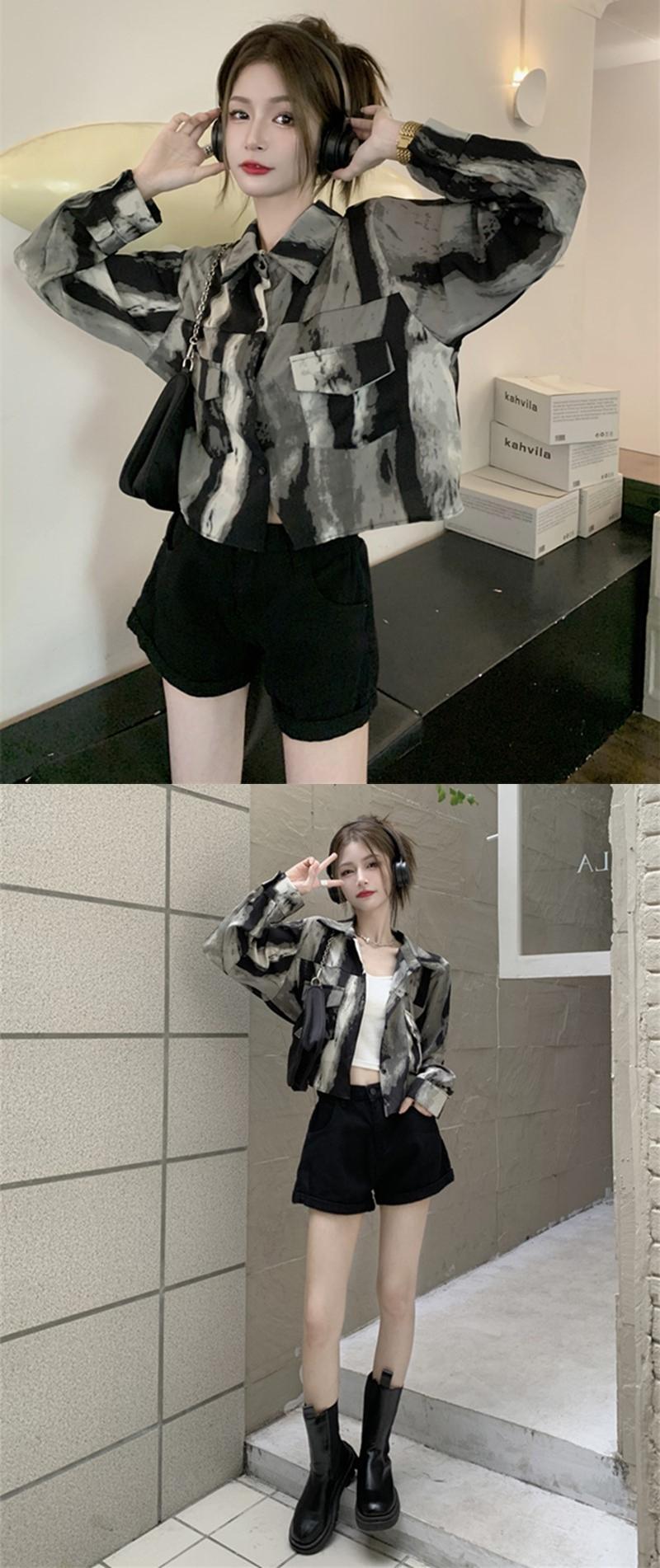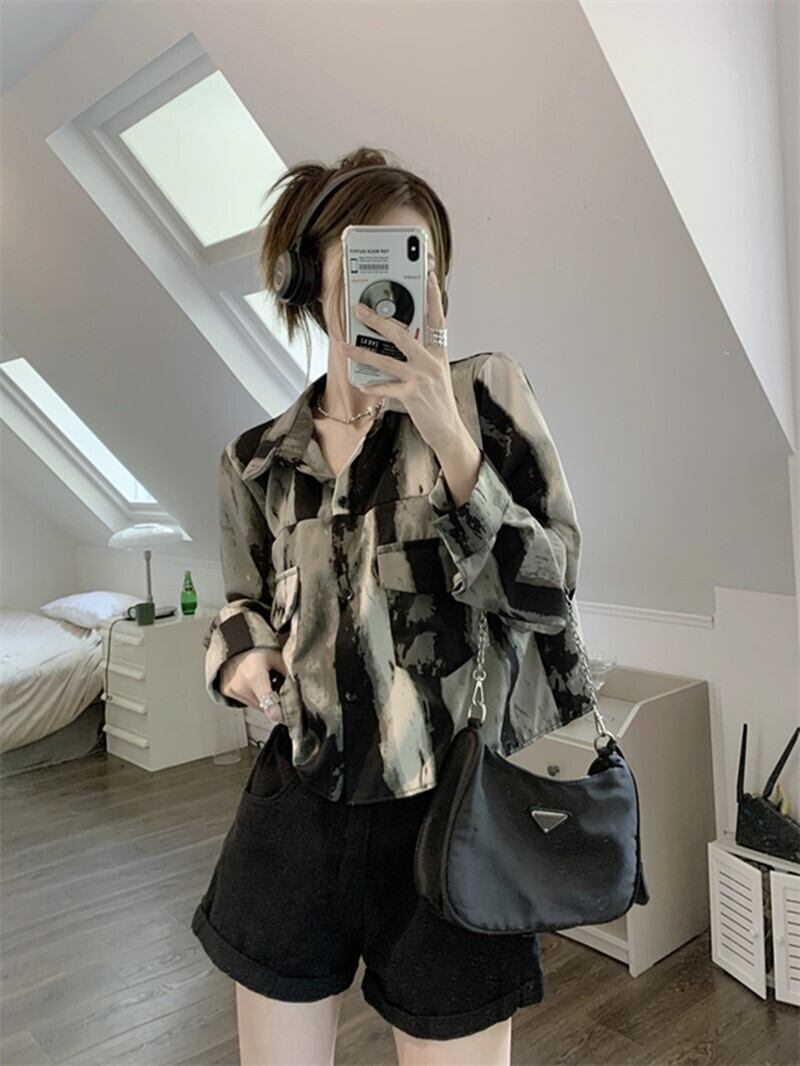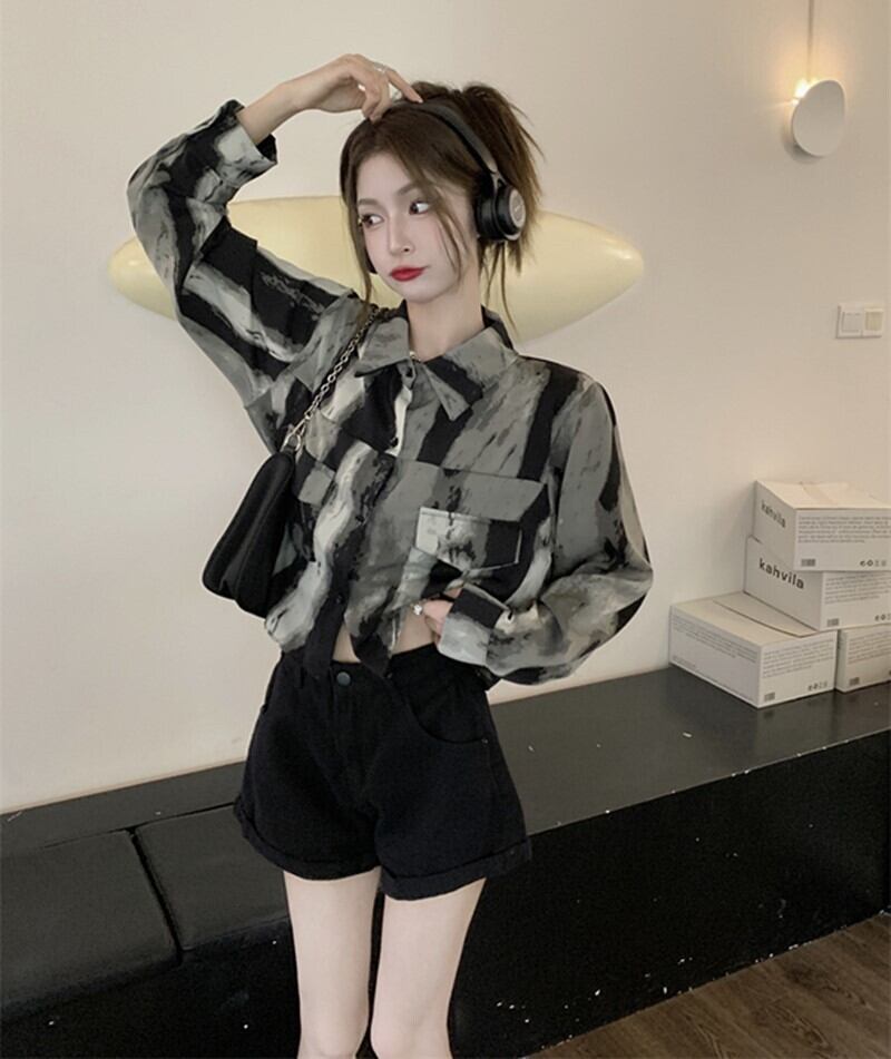 retro tie-dye print Polo collar shirt women's autumn 2022 new short loose long-sleeved cardigan top ショート ロング レトロ カーディガン オータム 秋物 0921939516208966