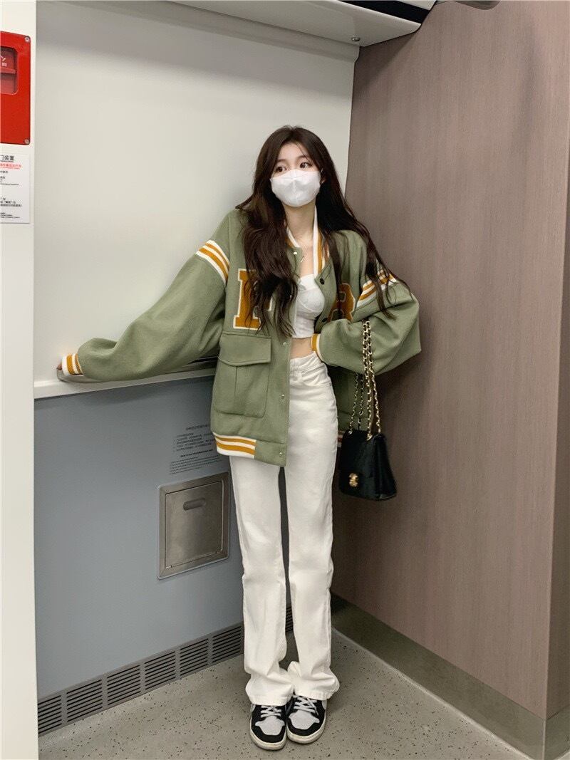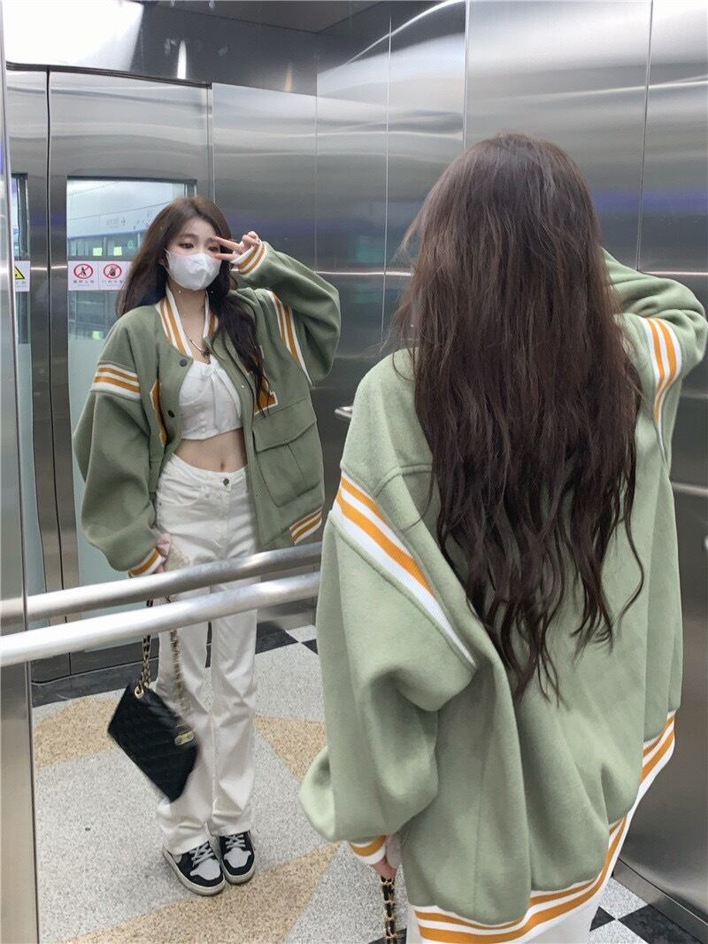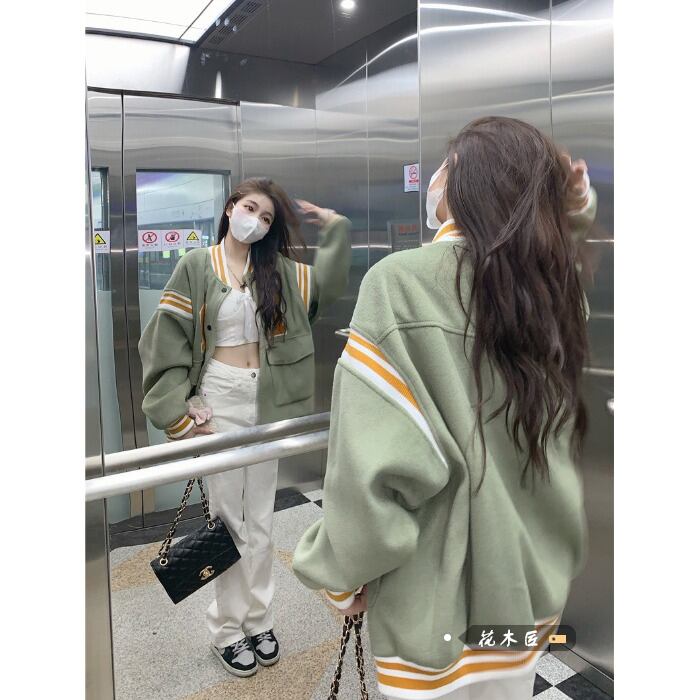 American retro green baseball unim jacket women's autumn design sense college style loose casual long-sleeved jacket top ロング レトロ カジュアル オータム 秋物 グリーン 0921941831846576