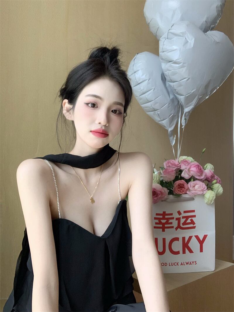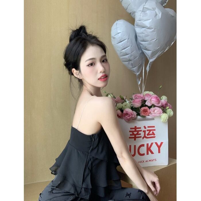 French retro temperament chiffon camisole women's summer 2022 new sexy off-the-shoulder short top ショート シフォン レトロ サマー 夏物 0921960931345805