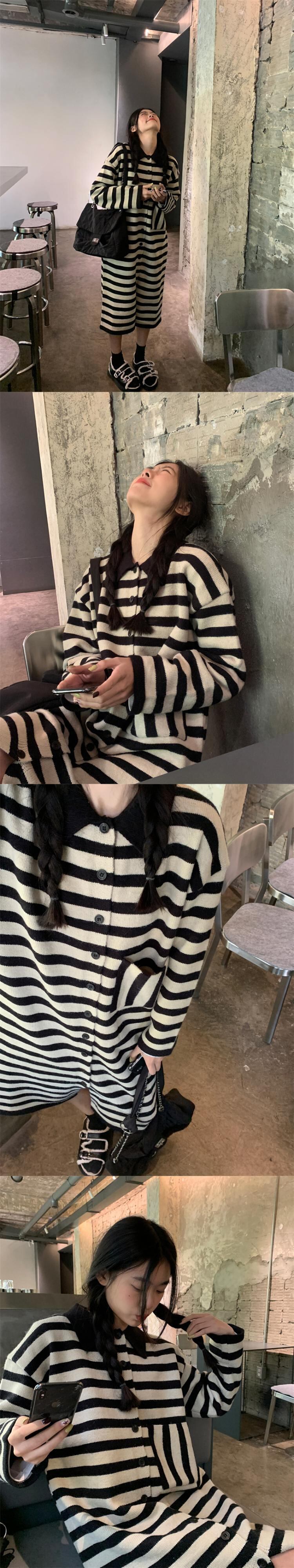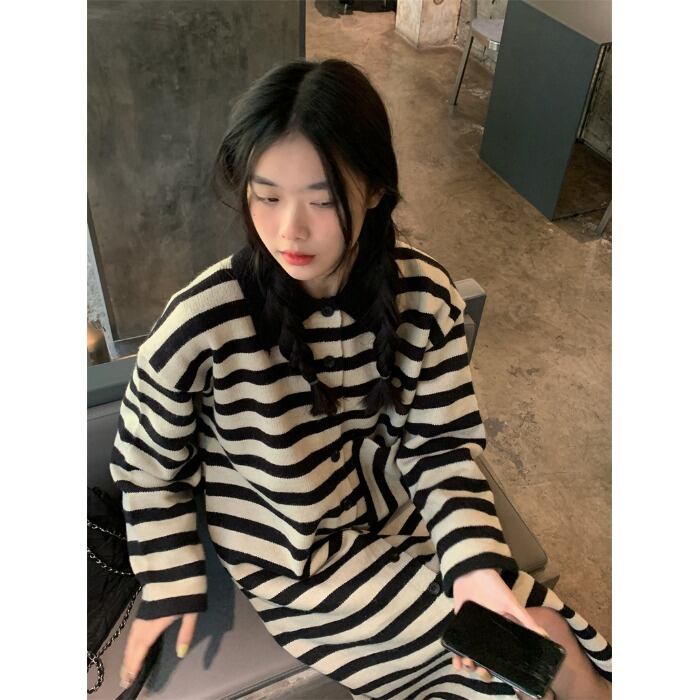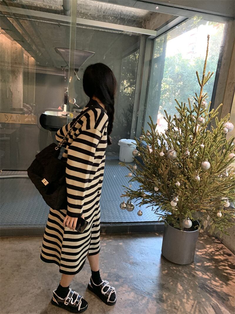 version of lazy striped long-sleeved polo collar knitted dress women's autumn 2022 new loose mid-length skirt ロング オータム 秋物 スカート ストライプ 0921971930651888