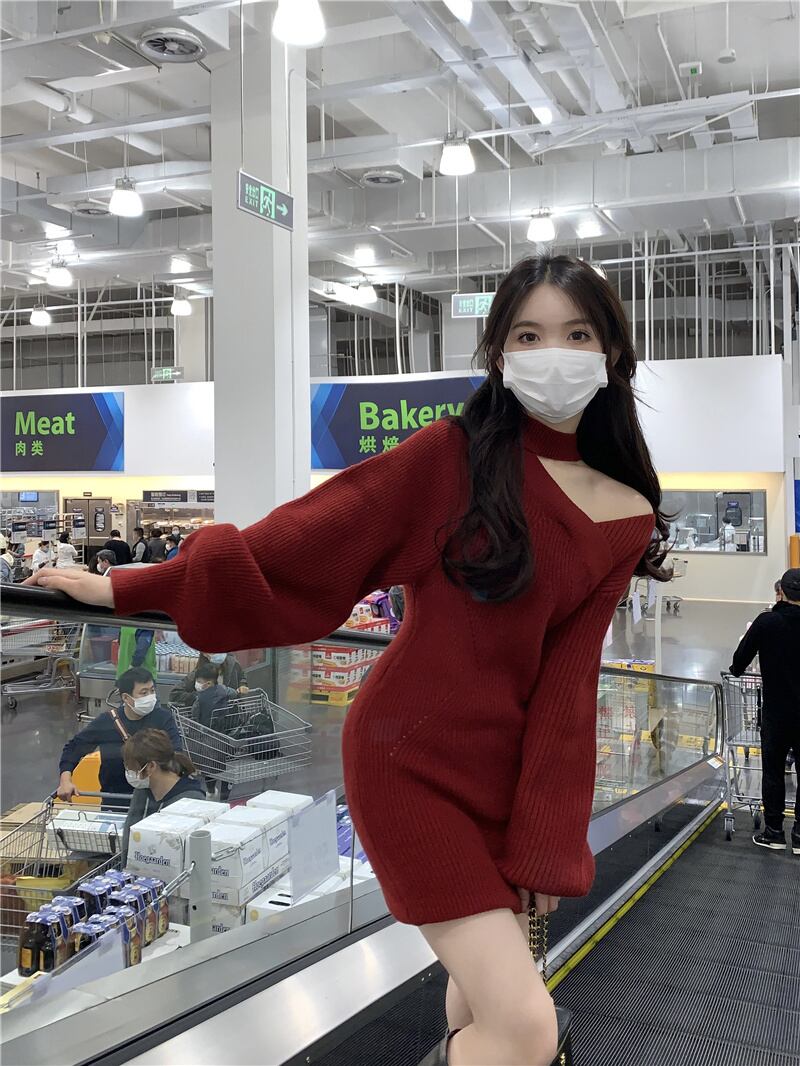 Pure desire off-the-shoulder red knitted dress women's autumn 2022 new design style temperament waist bag hip skirt レッド オータム 秋物 スカート 0921937993059523