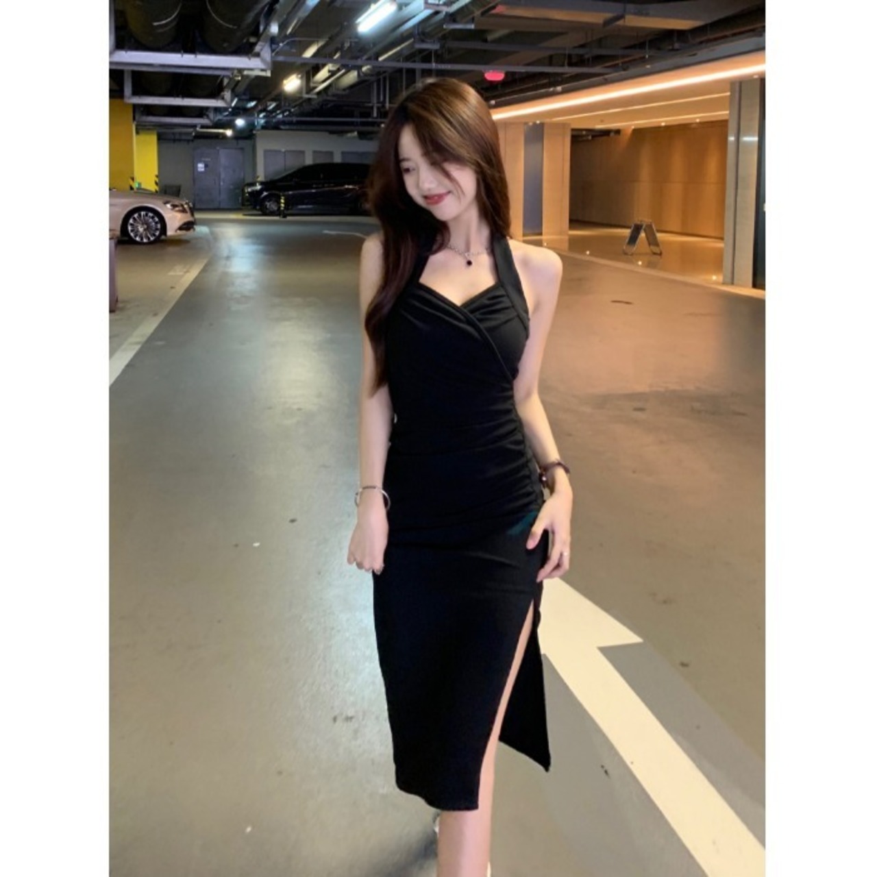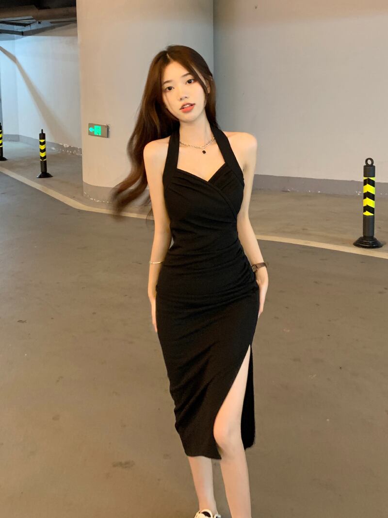 Pure Desire Sexy Slim Royal Sister Style Hanging Neck Dress Women's Early Autumn Black Bottoming Midi Skirt Thin Skirt ブラック オータム 秋物 スカート スリム 092194758541701
