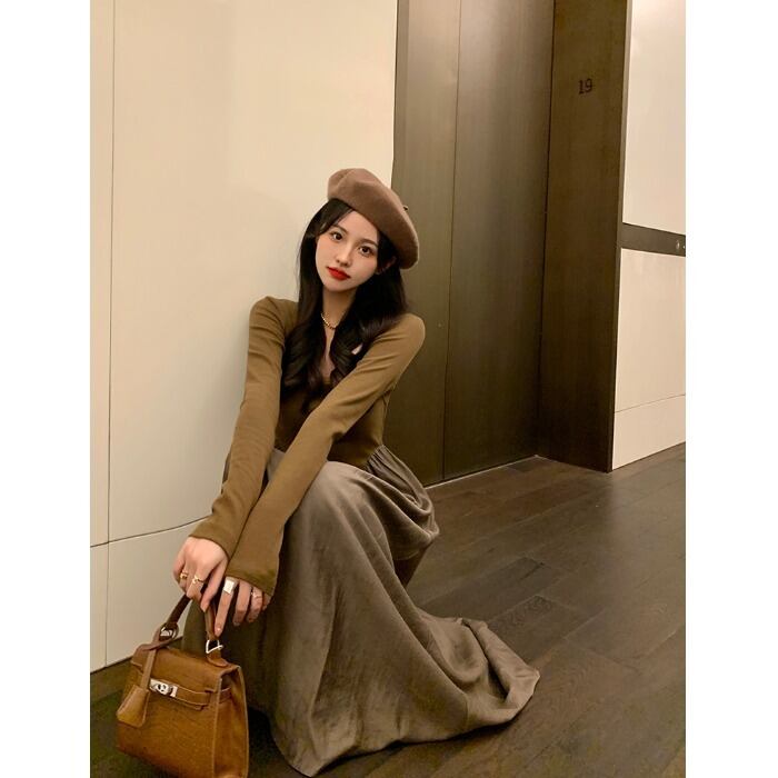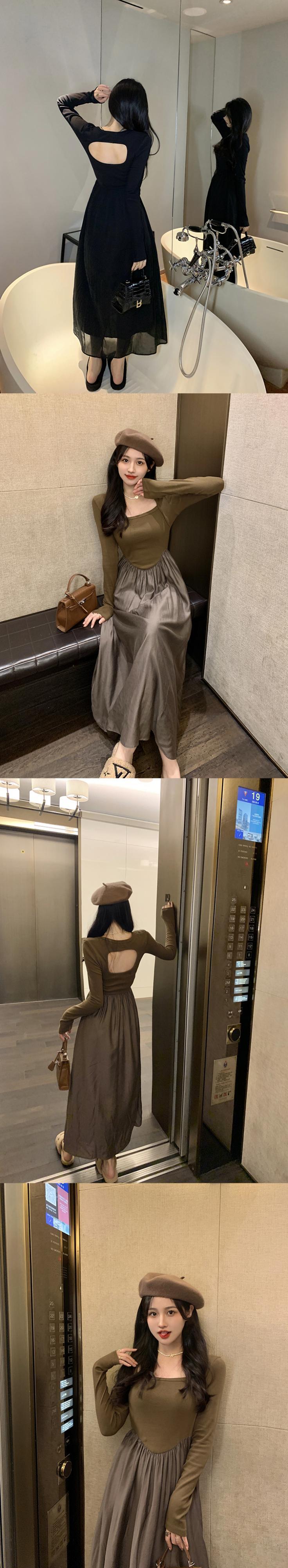 Gentle wind temperament hollow backless square neck long-sleeved dress women's autumn 2022 new style waist A-line skirt ロング オータム 秋物 スカート Aライン スクウェア 0921925920446331