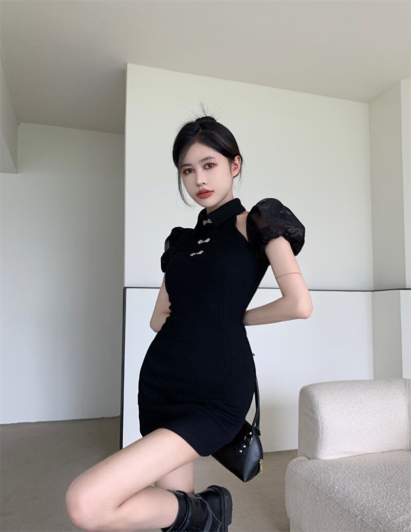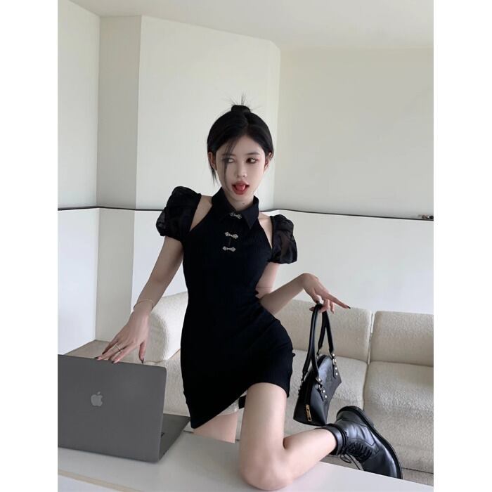 Chinese-style improved cheongsam chic puff sleeve dress women's summer 2022 new design sense waist bag hip skirt サマー 夏物 スカート 0921954659066955