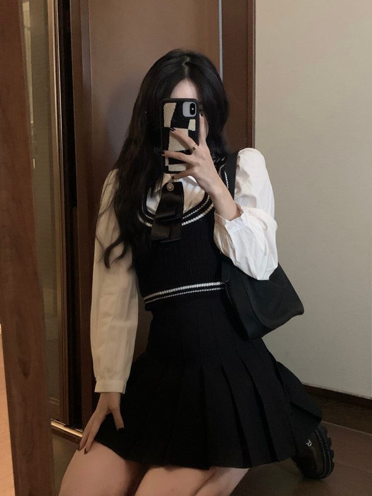version age-reducing western style fashion suit skirt women's autumn 2022 new knitted vest shirt pleated skirt three-piece suit プリーツ オータム 秋物 スカート 092191808634510