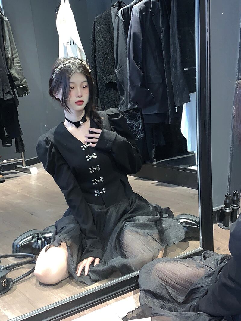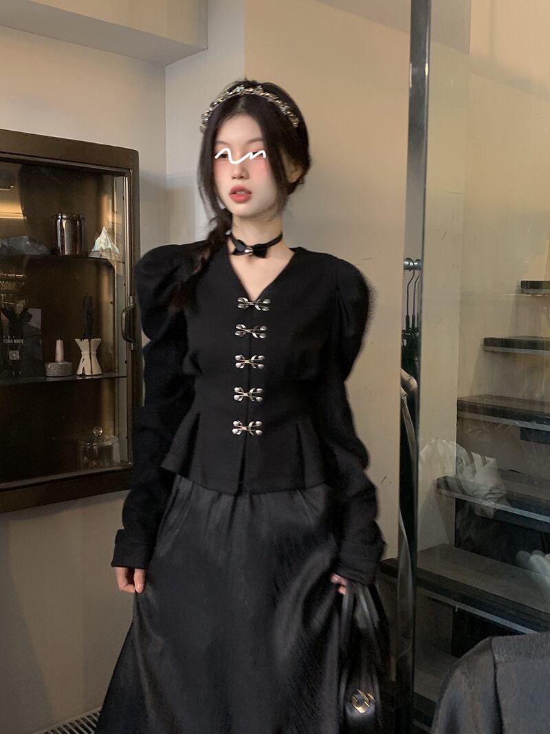 Hepburn style retro fashion suit women's autumn 2022 new long-sleeved buttoned top mid-length gauze skirt two-piece set ロング レトロ オータム 秋物 スカート 0921919182237707