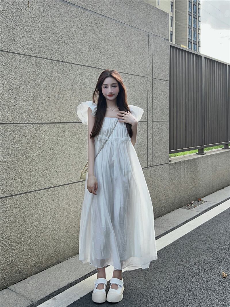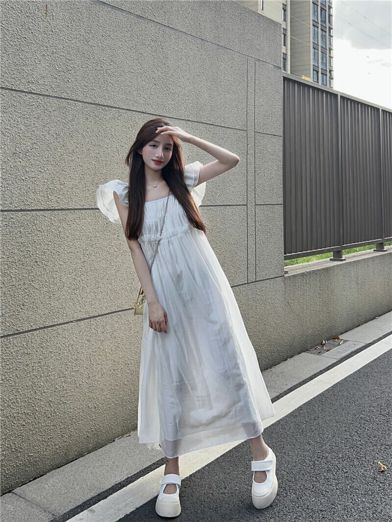 French fairy small flying sleeve dress women's summer 2022 new mid-length temperament square collar slim first love skirt サマー 夏物 スカート スリム スクウェア 0921982781926648