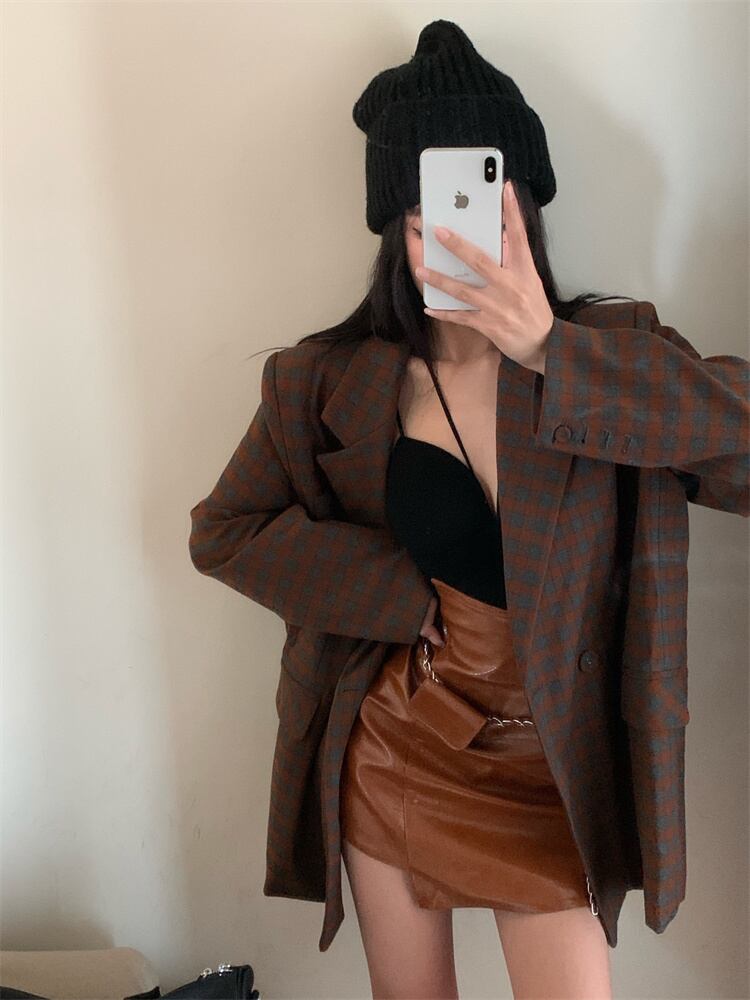 version of fashion fried street loose plaid suit jacket women's autumn 2022 new mid-length suit top ストリート オータム 秋物 0921936832980987
