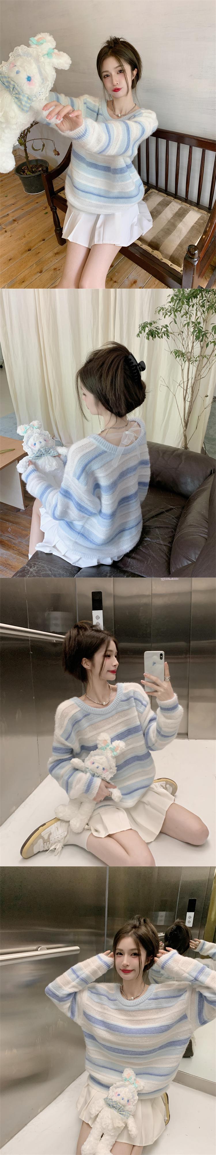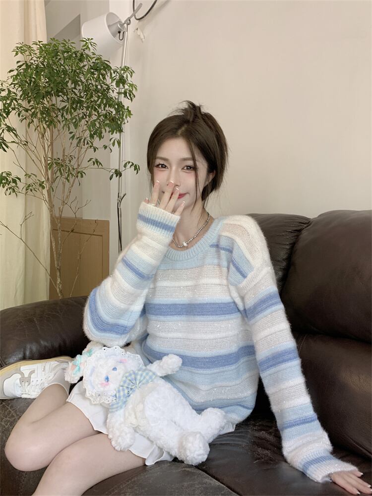 Lazy Lace-Up Striped Pullover Sweater Women's Autumn 2022 Girls Age-Reducing Loose Knit Tops レース オータム 秋物 ストライプ レースアップ 0921966269193035
