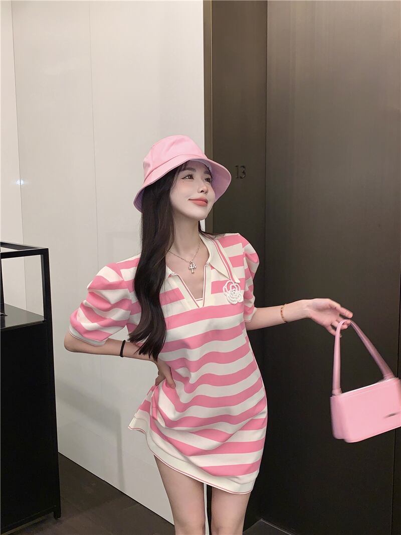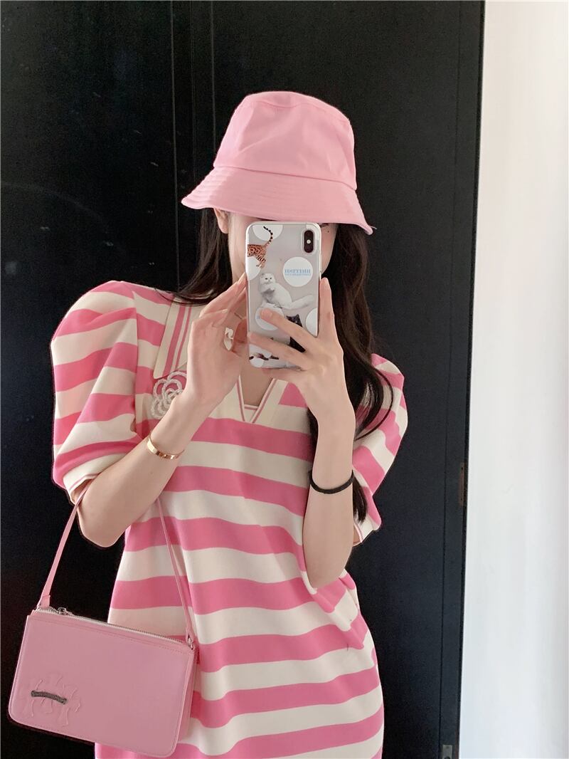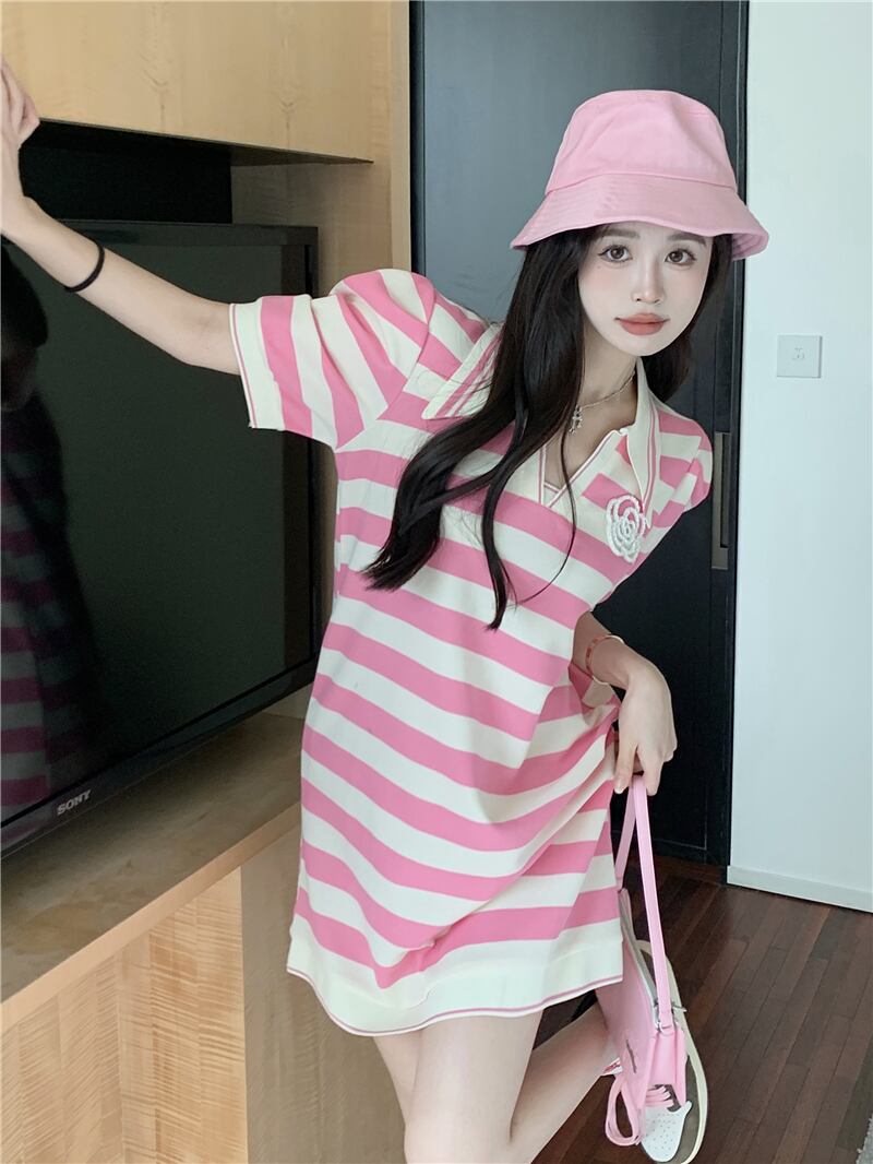 Sweet camellia pink striped short-sleeved dress women's summer 2022 new version loose and thin a-line skirt ピンク 大人ガーリー スウィート キュート カジュアル サマー 夏物 スカート Aライン ストライプ 0921979586870227